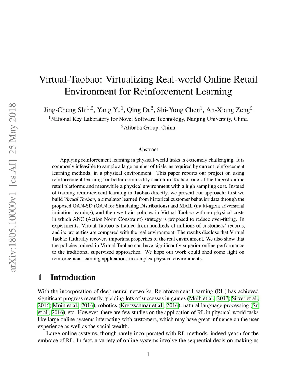 Applying reinforcement learning in physical-world tasks is extremely challenging. It is commonly infeasible to sample a large number of trials, as required by current reinforcement learning methods, in a physical environment. This paper reports our project on using reinforcement learning for better commodity search in Taobao, one of the largest online retail platforms and meanwhile a physical environment with a high sampling cost. Instead of training reinforcement learning in Taobao directly, we present our approach: first we build Virtual Taobao, a simulator learned from historical customer behavior data through the proposed GAN-SD (GAN for Simulating Distributions) and MAIL (multi-agent adversarial imitation learning), and then we train policies in Virtual Taobao with no physical costs in which ANC (Action Norm Constraint) strategy is proposed to reduce over-fitting. In experiments, Virtual Taobao is trained from hundreds of millions of customers' records, and its properties are compared with the real environment. The results disclose that Virtual Taobao faithfully recovers important properties of the real environment. We also show that the policies trained in Virtual Taobao can have significantly superior online performance to the traditional supervised approaches. We hope our work could shed some light on reinforcement learning applications in complex physical environments.