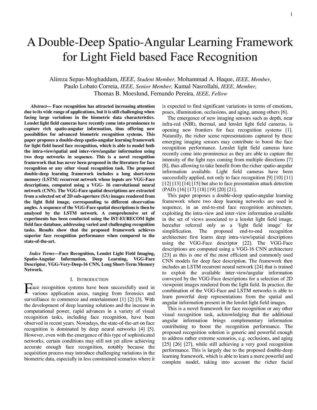 Face recognition has attracted increasing attention due to its wide range of applications, but it is still challenging when facing large variations in the biometric data characteristics. Lenslet light field cameras have recently come into prominence to capture rich spatio-angular information, thus offering new possibilities for advanced biometric recognition systems. This paper proposes a double-deep spatio-angular learning framework for light field based face recognition, which is able to learn both texture and angular dynamics in sequence using convolutional representations; this is a novel recognition framework that has never been proposed before for either face recognition or any other visual recognition task. The proposed double-deep learning framework includes a long short-term memory (LSTM) recurrent network whose inputs are VGG-Face descriptions that are computed using a VGG-Very-Deep-16 convolutional neural network (CNN). The VGG-16 network uses different face viewpoints rendered from a full light field image, which are organised as a pseudo-video sequence. A comprehensive set of experiments has been conducted with the IST-EURECOM light field face database, for varied and challenging recognition tasks. Results show that the proposed framework achieves superior face recognition performance when compared to the state-of-the-art.