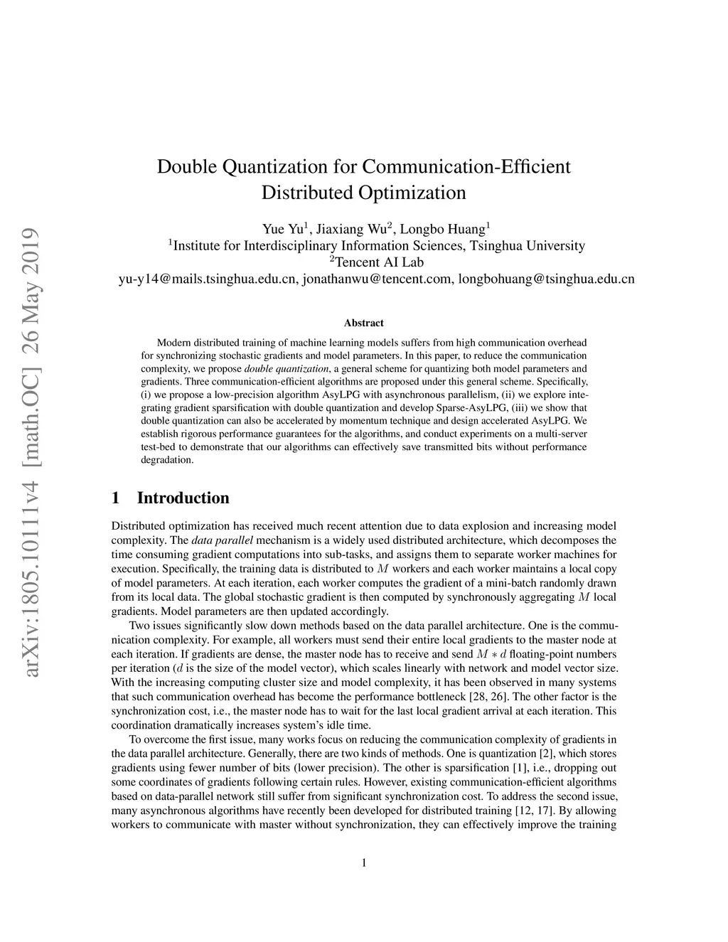 Modern distributed training of machine learning models suffers from high communication overhead for synchronizing stochastic gradients and model parameters. In this paper, to reduce the communication complexity, we propose \emph{double quantization}, a general scheme for quantizing both model parameters and gradients. Three communication-efficient algorithms are proposed under this general scheme. Specifically, (i) we propose a low-precision algorithm AsyLPG with asynchronous parallelism, (ii) we explore integrating gradient sparsification with double quantization and develop Sparse-AsyLPG, (iii) we show that double quantization can also be accelerated by momentum technique and design accelerated AsyLPG. We establish rigorous performance guarantees for the algorithms, and conduct experiments on a multi-server test-bed to demonstrate that our algorithms can effectively save transmitted bits without performance degradation.