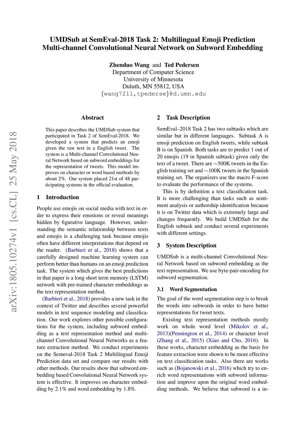 This paper describes the UMDSub system that participated in Task 2 of SemEval-2018. We developed a system that predicts an emoji given the raw text in a English tweet. The system is a Multi-channel Convolutional Neural Network based on subword embeddings for the representation of tweets. This model improves on character or word based methods by about 2\%. Our system placed 21st of 48 participating systems in the official evaluation.