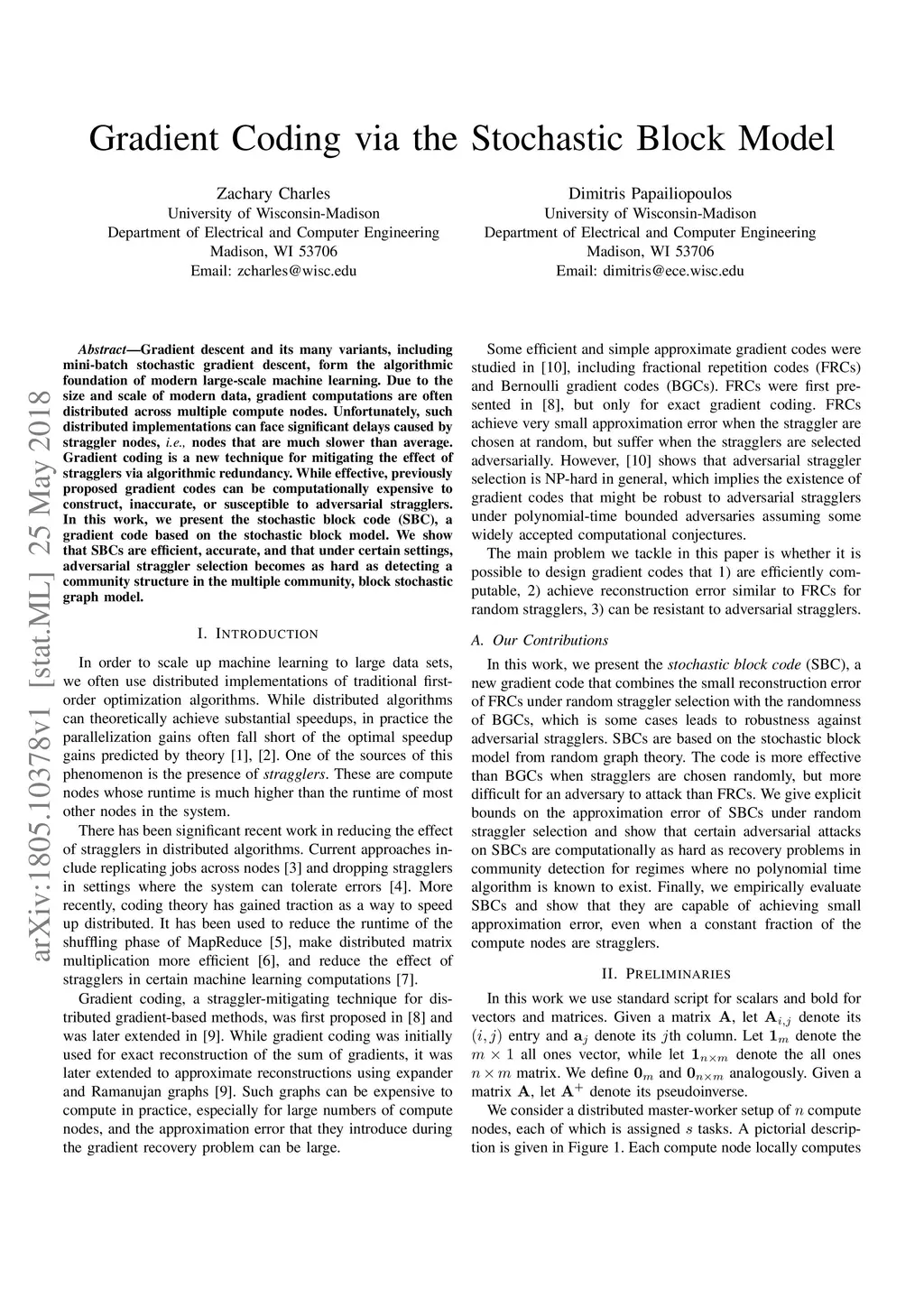Gradient descent and its many variants, including mini-batch stochastic gradient descent, form the algorithmic foundation of modern large-scale machine learning. Due to the size and scale of modern data, gradient computations are often distributed across multiple compute nodes. Unfortunately, such distributed implementations can face significant delays caused by straggler nodes, i.e., nodes that are much slower than average. Gradient coding is a new technique for mitigating the effect of stragglers via algorithmic redundancy. While effective, previously proposed gradient codes can be computationally expensive to construct, inaccurate, or susceptible to adversarial stragglers. In this work, we present the stochastic block code (SBC), a gradient code based on the stochastic block model. We show that SBCs are efficient, accurate, and that under certain settings, adversarial straggler selection becomes as hard as detecting a community structure in the multiple community, block stochastic graph model.