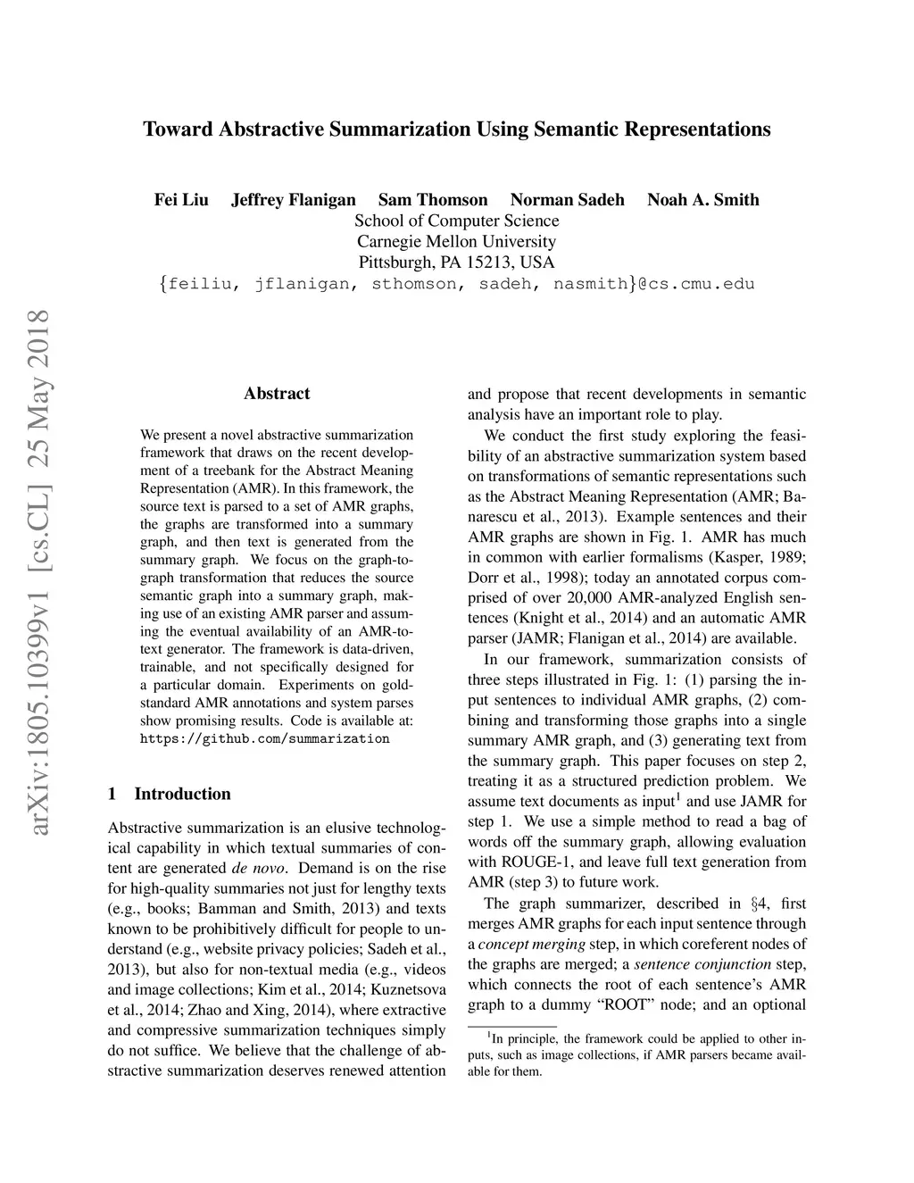 We present a novel abstractive summarization framework that draws on the recent development of a treebank for the Abstract Meaning Representation (AMR). In this framework, the source text is parsed to a set of AMR graphs, the graphs are transformed into a summary graph, and then text is generated from the summary graph. We focus on the graph-to-graph transformation that reduces the source semantic graph into a summary graph, making use of an existing AMR parser and assuming the eventual availability of an AMR-to-text generator. The framework is data-driven, trainable, and not specifically designed for a particular domain. Experiments on gold-standard AMR annotations and system parses show promising results. Code is available at: https://github.com/summarization