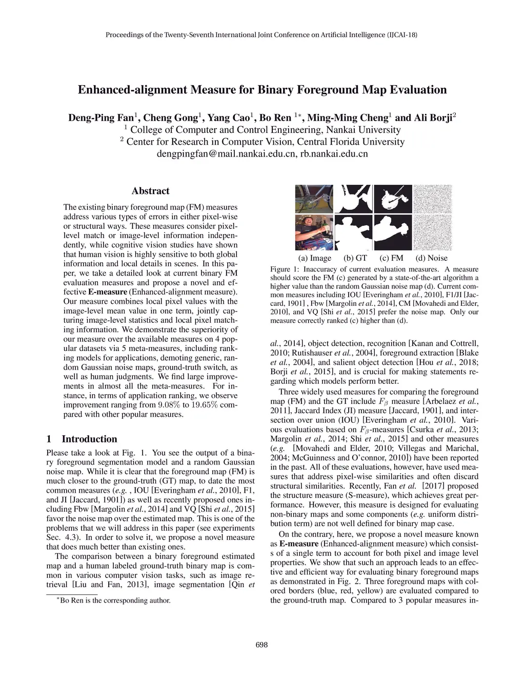 The existing binary foreground map (FM) measures to address various types of errors in either pixel-wise or structural ways. These measures consider pixel-level match or image-level information independently, while cognitive vision studies have shown that human vision is highly sensitive to both global information and local details in scenes. In this paper, we take a detailed look at current binary FM evaluation measures and propose a novel and effective E-measure (Enhanced-alignment measure). Our measure combines local pixel values with the image-level mean value in one term, jointly capturing image-level statistics and local pixel matching information. We demonstrate the superiority of our measure over the available measures on 4 popular datasets via 5 meta-measures, including ranking models for applications, demoting generic, random Gaussian noise maps, ground-truth switch, as well as human judgments. We find large improvements in almost all the meta-measures. For instance, in terms of application ranking, we observe improvementrangingfrom9.08% to 19.65% compared with other popular measures.