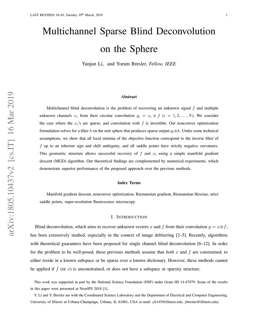 Multichannel blind deconvolution is the problem of recovering an unknown signal and multiple unknown channels from convolutional measurements (). We consider the case where the 's are sparse, and convolution with is invertible. Our nonconvex optimization formulation solves for a filter on the unit sphere that produces sparse output . Under some technical assumptions, we show that all local minima of the objective function correspond to the inverse filter of up to an inherent sign and shift ambiguity, and all saddle points have strictly negative curvatures. This geometric structure allows successful recovery of and using a simple manifold gradient descent algorithm with random initialization. Our theoretical findings are complemented by numerical experiments, which demonstrate superior performance of the proposed approach over the previous methods.