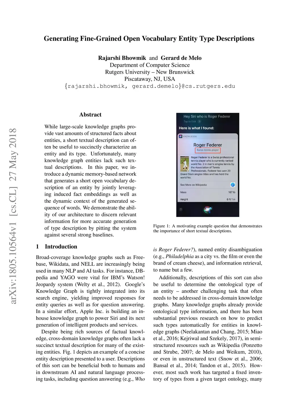 While large-scale knowledge graphs provide vast amounts of structured facts about entities, a short textual description can often be useful to succinctly characterize an entity and its type. Unfortunately, many knowledge graph entities lack such textual descriptions. In this paper, we introduce a dynamic memory-based network that generates a short open vocabulary description of an entity by jointly leveraging induced fact embeddings as well as the dynamic context of the generated sequence of words. We demonstrate the ability of our architecture to discern relevant information for more accurate generation of type description by pitting the system against several strong baselines.