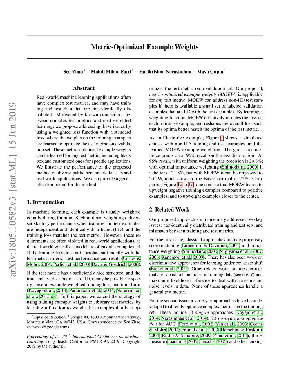 Real-world machine learning applications often have complex test metrics, and may have training and test data that are not identically distributed. Motivated by known connections between complex test metrics and cost-weighted learning, we propose addressing these issues by using a weighted loss function with a standard loss, where the weights on the training examples are learned to optimize the test metric on a validation set. These metric-optimized example weights can be learned for any test metric, including black box and customized ones for specific applications. We illustrate the performance of the proposed method on diverse public benchmark datasets and real-world applications. We also provide a generalization bound for the method.