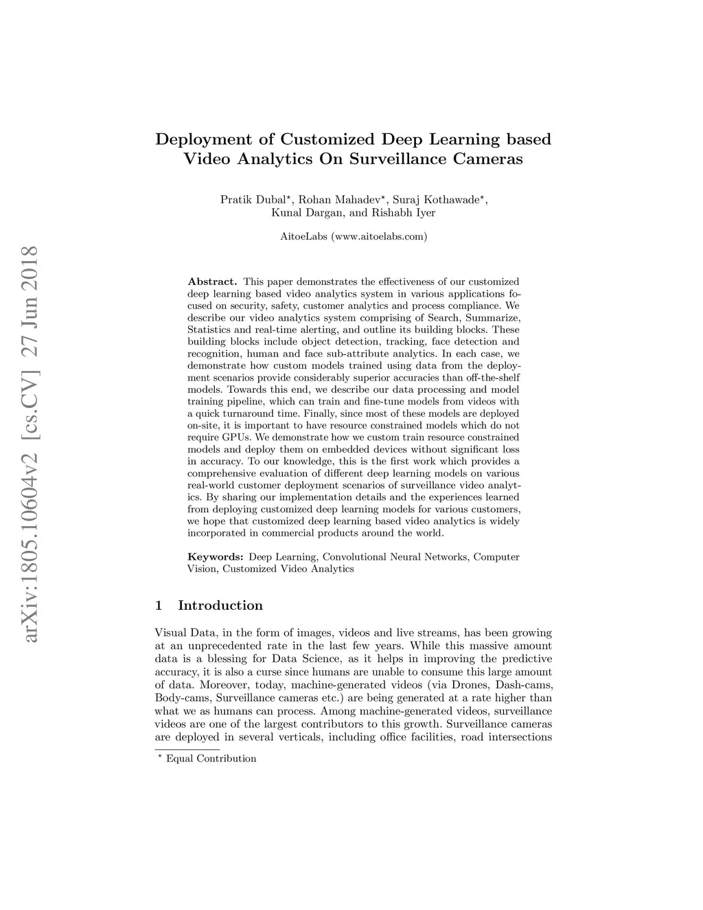 This paper demonstrates the effectiveness of our customized deep learning based video analytics system in various applications focused on security, safety, customer analytics and process compliance. We describe our video analytics system comprising of Search, Summarize, Statistics and real-time alerting, and outline its building blocks. These building blocks include object detection, tracking, face detection and recognition, human and face sub-attribute analytics. In each case, we demonstrate how custom models trained using data from the deployment scenarios provide considerably superior accuracies than off-the-shelf models. Towards this end, we describe our data processing and model training pipeline, which can train and fine-tune models from videos with a quick turnaround time. Finally, since most of these models are deployed on-site, it is important to have resource constrained models which do not require GPUs. We demonstrate how we custom train resource constrained models and deploy them on embedded devices without significant loss in accuracy. To our knowledge, this is the first work which provides a comprehensive evaluation of different deep learning models on various real-world customer deployment scenarios of surveillance video analytics. By sharing our implementation details and the experiences learned from deploying customized deep learning models for various customers, we hope that customized deep learning based video analytics is widely incorporated in commercial products around the world.