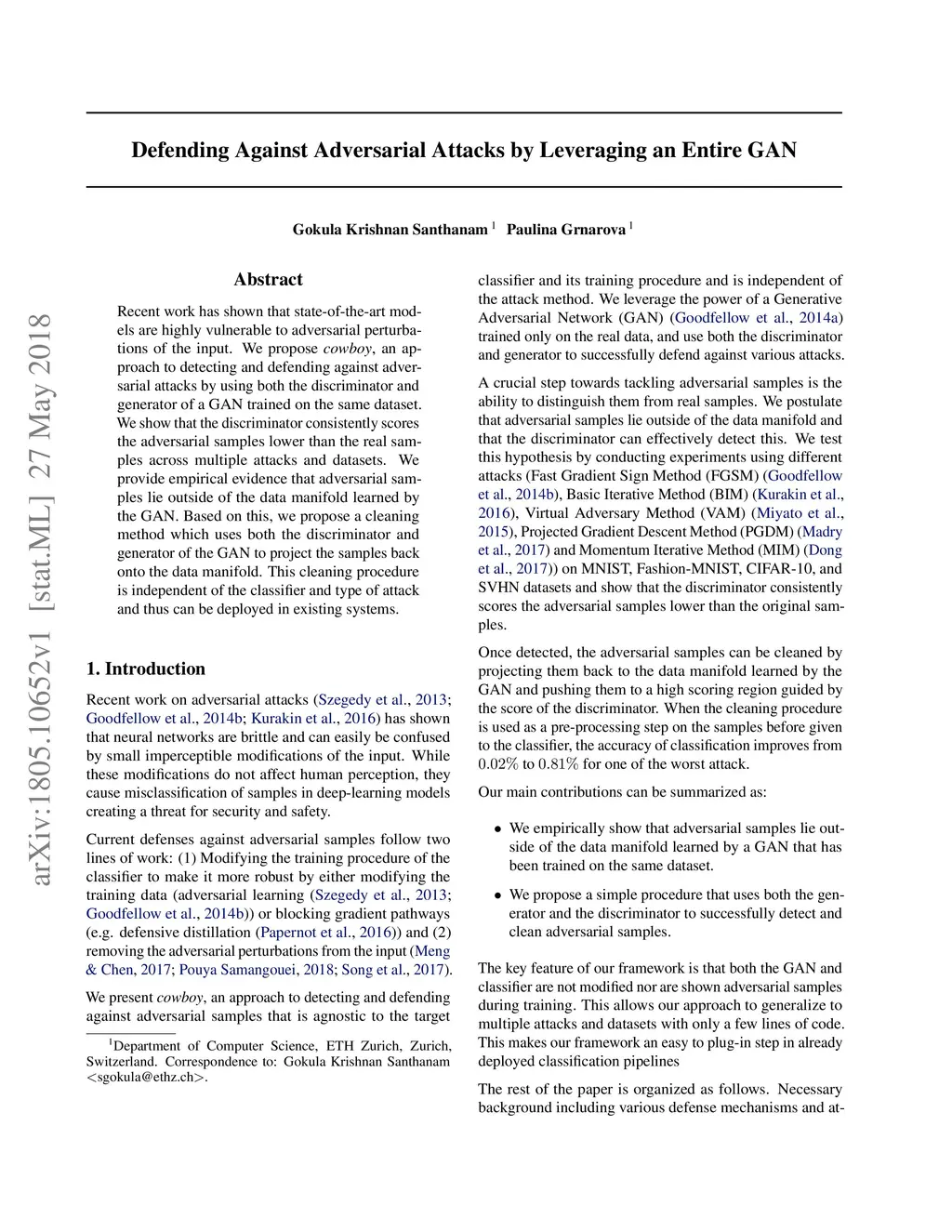 Recent work has shown that state-of-the-art models are highly vulnerable to adversarial perturbations of the input. We propose cowboy, an approach to detecting and defending against adversarial attacks by using both the discriminator and generator of a GAN trained on the same dataset. We show that the discriminator consistently scores the adversarial samples lower than the real samples across multiple attacks and datasets. We provide empirical evidence that adversarial samples lie outside of the data manifold learned by the GAN. Based on this, we propose a cleaning method which uses both the discriminator and generator of the GAN to project the samples back onto the data manifold. This cleaning procedure is independent of the classifier and type of attack and thus can be deployed in existing systems.