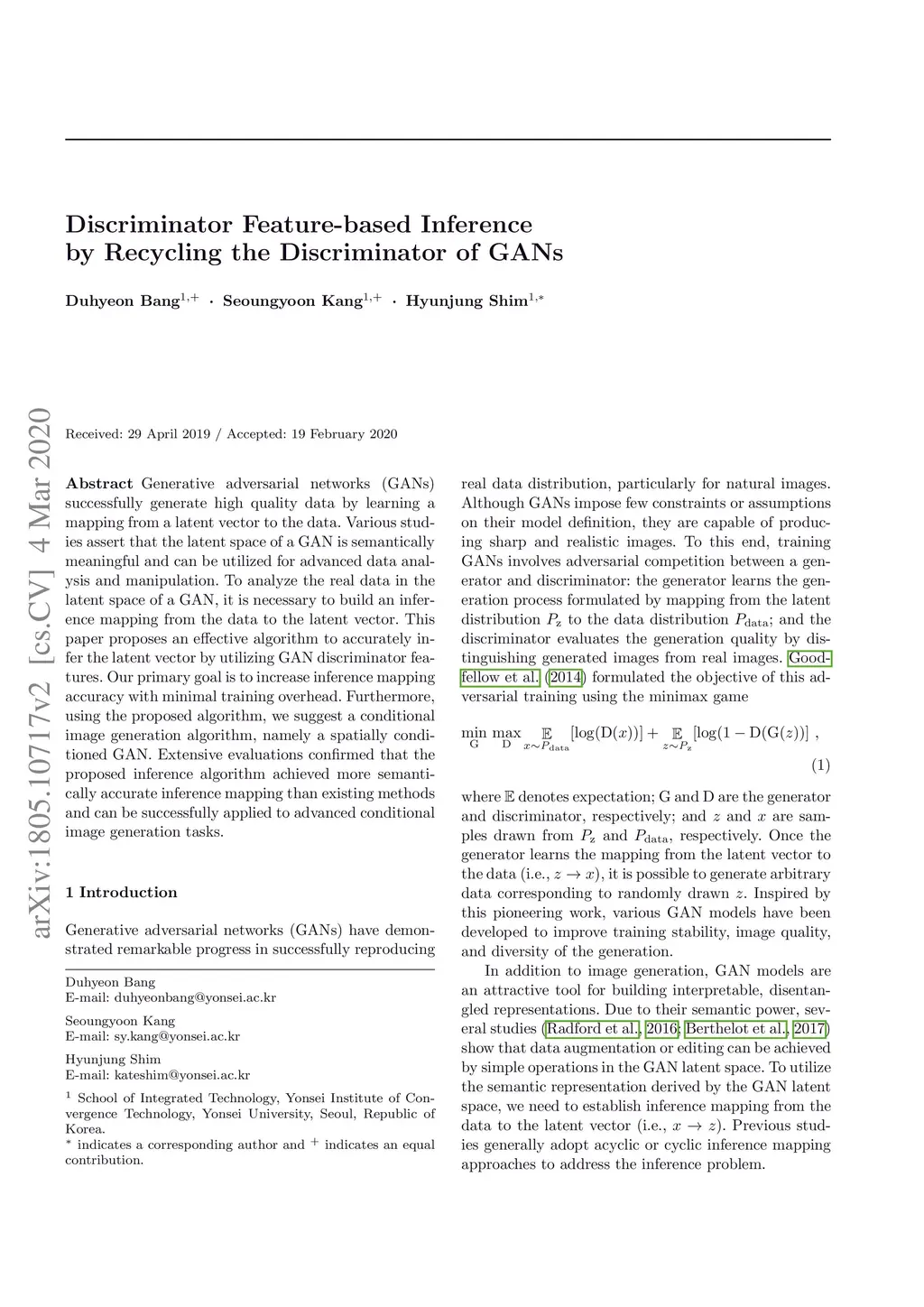 Generative adversarial networks (GANs)successfully generate high quality data by learning amapping from a latent vector to the data. Various studies assert that the latent space of a GAN is semanticallymeaningful and can be utilized for advanced data analysis and manipulation. To analyze the real data in thelatent space of a GAN, it is necessary to build an inference mapping from the data to the latent vector. Thispaper proposes an effective algorithm to accurately infer the latent vector by utilizing GAN discriminator features. Our primary goal is to increase inference mappingaccuracy with minimal training overhead. Furthermore,using the proposed algorithm, we suggest a conditionalimage generation algorithm, namely a spatially conditioned GAN. Extensive evaluations confirmed that theproposed inference algorithm achieved more semantically accurate inference mapping than existing methodsand can be successfully applied to advanced conditionalimage generation tasks.