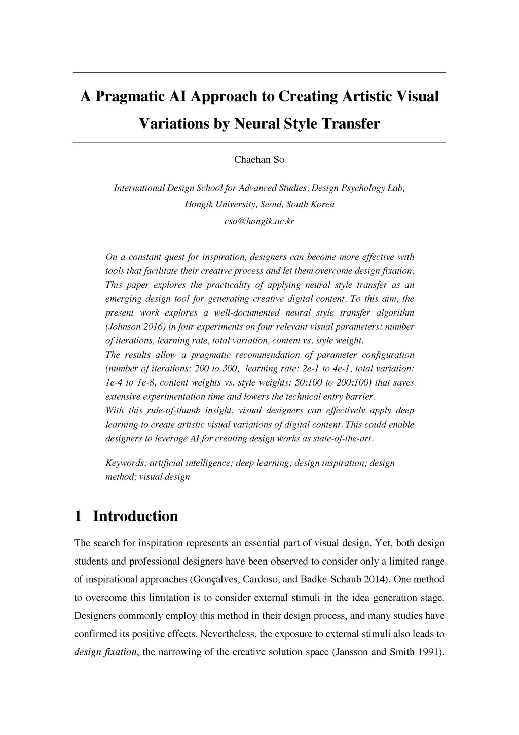 On a constant quest for inspiration, designers can become more effective with tools that facilitate their creative process and let them overcome design fixation. This paper explores the practicality of applying neural style transfer as an emerging design tool for generating creative digital content. To this aim, the present work explores a well-documented neural style transfer algorithm (Johnson 2016) in four experiments on four relevant visual parameters: number of iterations, learning rate, total variation, content vs. style weight. The results allow a pragmatic recommendation of parameter configuration (number of iterations: 200 to 300, learning rate: 2e-1 to 4e-1, total variation: 1e-4 to 1e-8, content weights vs. style weights: 50:100 to 200:100) that saves extensive experimentation time and lowers the technical entry barrier. With this rule-of-thumb insight, visual designers can effectively apply deep learning to create artistic visual variations of digital content. This could enable designers to leverage AI for creating design works as state-of-the-art.
