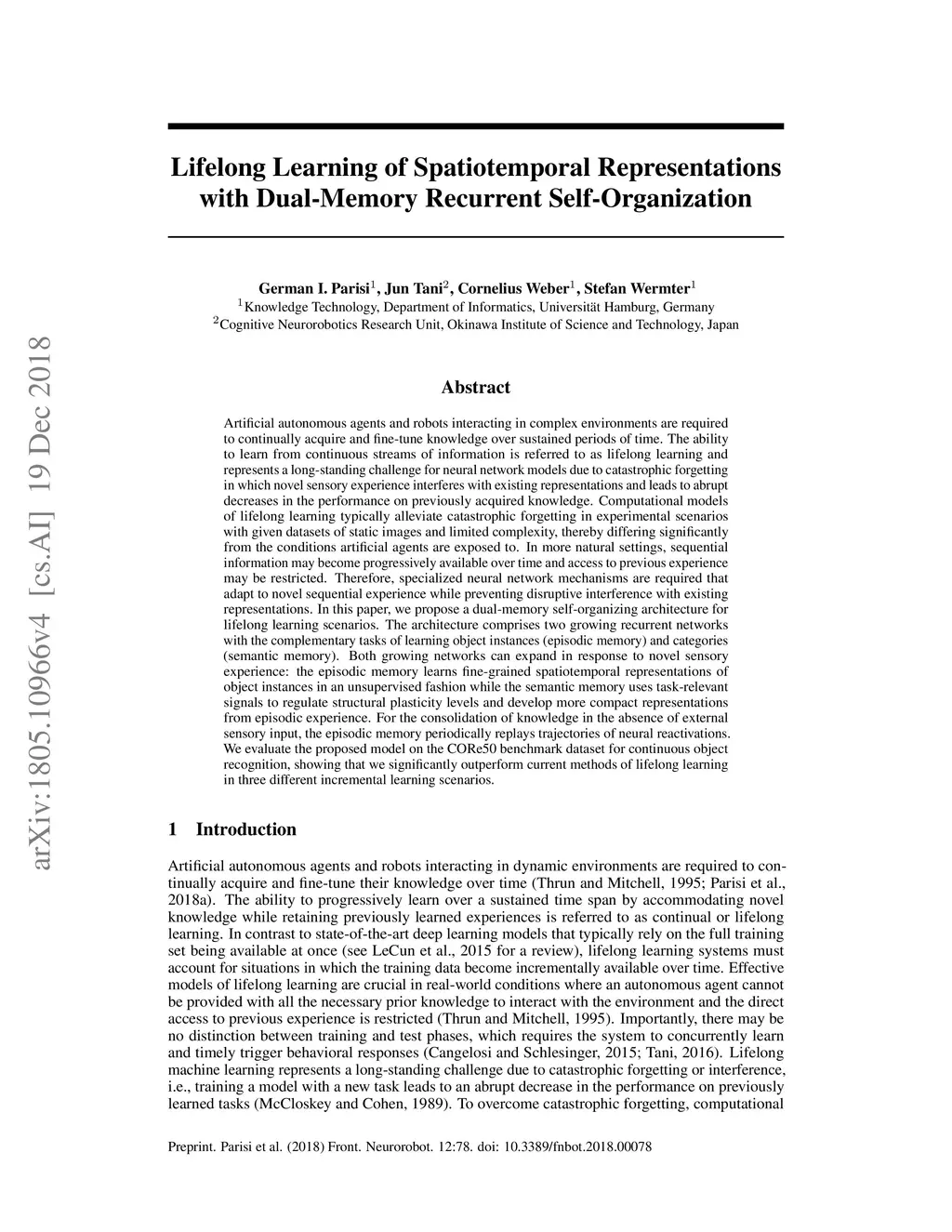 Artificial autonomous agents and robots interacting in complex environments are required to continually acquire and fine-tune knowledge over sustained periods of time. The ability to learn from continuous streams of information is referred to as lifelong learning and represents a long-standing challenge for neural network models due to catastrophic forgetting. Computational models of lifelong learning typically alleviate catastrophic forgetting in experimental scenarios with given datasets of static images and limited complexity, thereby differing significantly from the conditions artificial agents are exposed to. In more natural settings, sequential information may become progressively available over time and access to previous experience may be restricted. In this paper, we propose a dual-memory self-organizing architecture for lifelong learning scenarios. The architecture comprises two growing recurrent networks with the complementary tasks of learning object instances (episodic memory) and categories (semantic memory). Both growing networks can expand in response to novel sensory experience: the episodic memory learns fine-grained spatiotemporal representations of object instances in an unsupervised fashion while the semantic memory uses task-relevant signals to regulate structural plasticity levels and develop more compact representations from episodic experience. For the consolidation of knowledge in the absence of external sensory input, the episodic memory periodically replays trajectories of neural reactivations. We evaluate the proposed model on the CORe50 benchmark dataset for continuous object recognition, showing that we significantly outperform current methods of lifelong learning in three different incremental learning scenarios