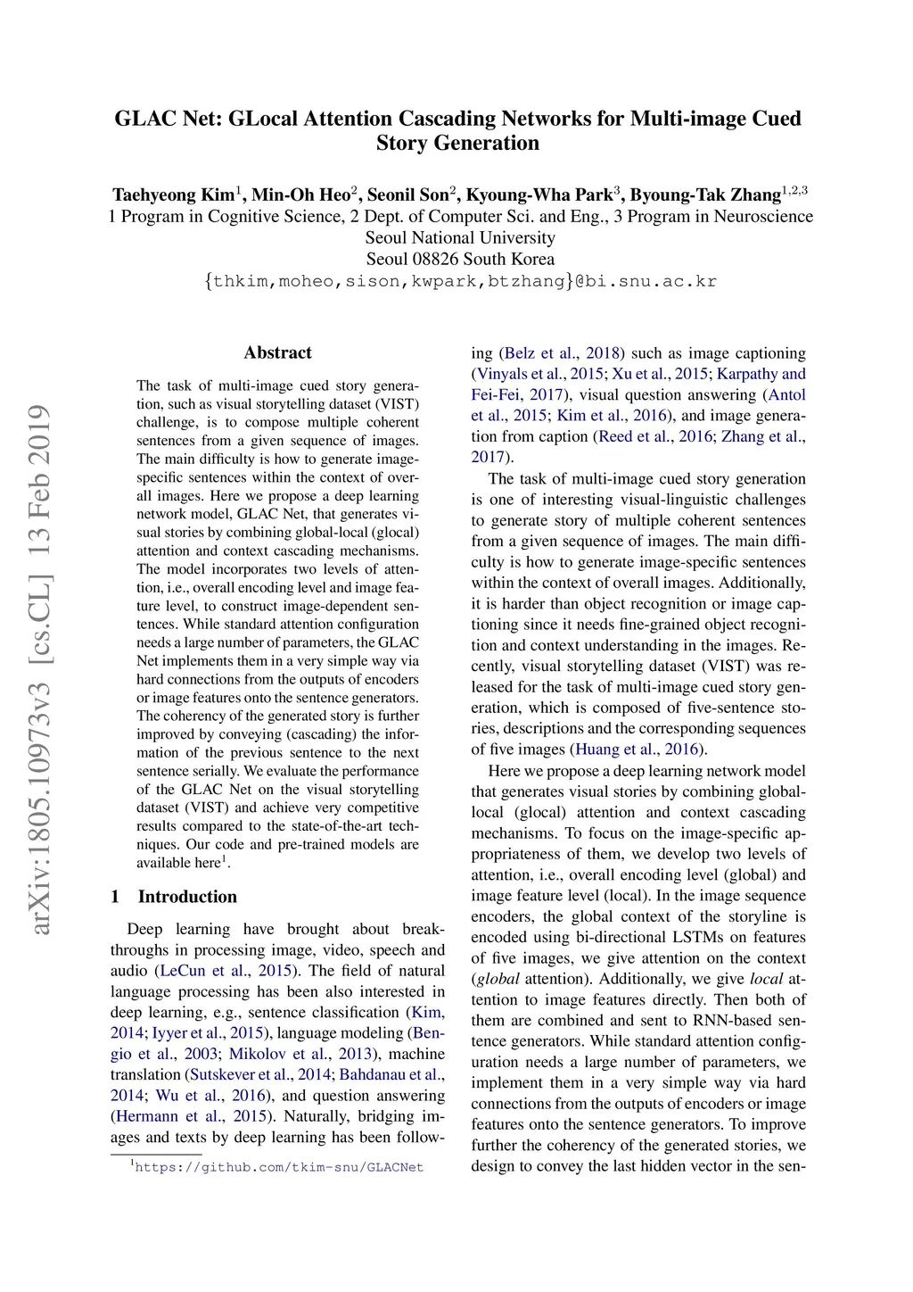 GLAC Net: GLocal Attention Cascading Networks for Multi-image Cued Story