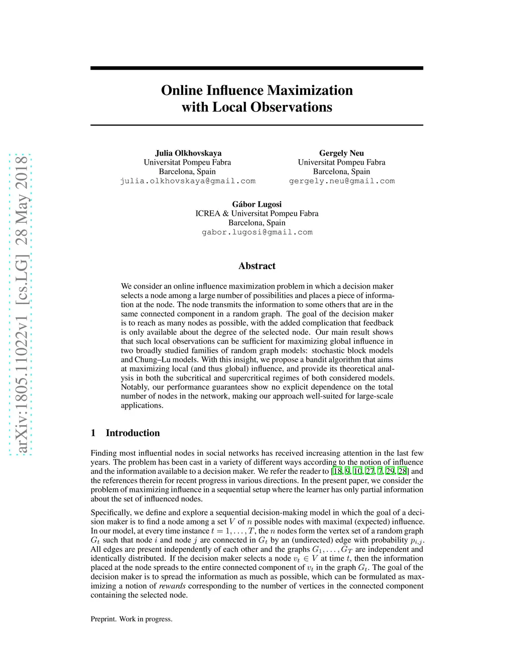 We consider an online influence maximization problem in which a decision maker selects a node among a large number of possibilities and places a piece of information at the node. The node transmits the information to some others that are in the same connected component in a random graph. The goal of the decision maker is to reach as many nodes as possible, with the added complication that feedback is only available about the degree of the selected node. Our main result shows that such local observations can be sufficient for maximizing global influence in two broadly studied families of random graph models: stochastic block models and Chung--Lu models. With this insight, we propose a bandit algorithm that aims at maximizing local (and thus global) influence, and provide its theoretical analysis in both the subcritical and supercritical regimes of both considered models. Notably, our performance guarantees show no explicit dependence on the total number of nodes in the network, making our approach well-suited for large-scale applications.