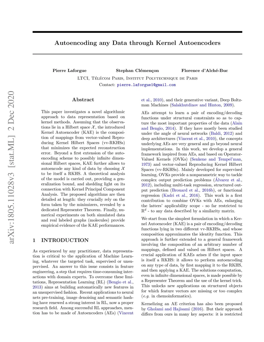 This paper investigates a novel algorithmic approach to data representation based on kernel methods. Assuming the observations lie in a Hilbert space X, this work introduces a new formulation of Representation Learning, stated as a regularized empirical risk minimization problem over a class of composite functions. These functions are obtained by composing elementary mappings from vector-valued Reproducing Kernel Hilbert Spaces (vv-RKHSs), and the risk is measured by the expected distortion rate in the input space X. The proposed algorithms crucially rely on the form taken by the minimizers, revealed by a dedicated Representer Theorem. Beyond a first extension of the autoencoding scheme to possibly infinite dimensional Hilbert spaces, an important application of the introduced Kernel Autoencoders (KAEs) arises when X is assumed itself to be a RKHS: this makes it possible to extract finite dimensional representations from any kind of data. Numerical experiments on simulated data as well as real labeled graphs (molecules) provide empirical evidences of the performance attained by KAEs.