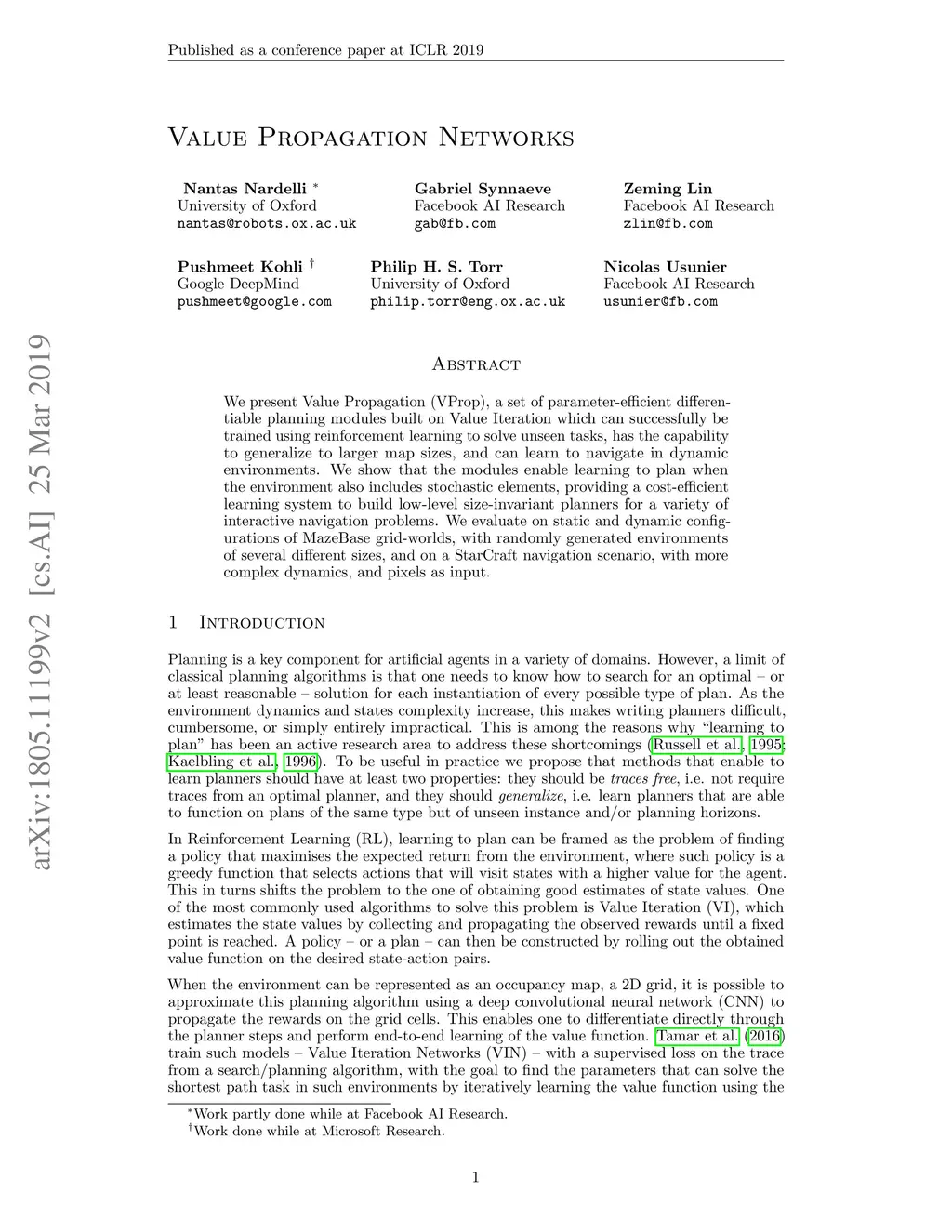 We present Value Propagation (VProp), a parameter-efficient differentiable planning module built on Value Iteration which can successfully be trained using reinforcement learning to solve unseen tasks, has the capability to generalize to larger map sizes, and can learn to navigate in dynamic environments. Furthermore, we show that the module enables learning to plan when the environment also includes stochastic elements, providing a cost-efficient learning system to build low-level size-invariant planners for a variety of interactive navigation problems. We evaluate on static and dynamic configurations of MazeBase grid-worlds, with randomly generated environments of several different sizes, and on a StarCraft navigation scenario, with more complex dynamics, and pixels as input.
