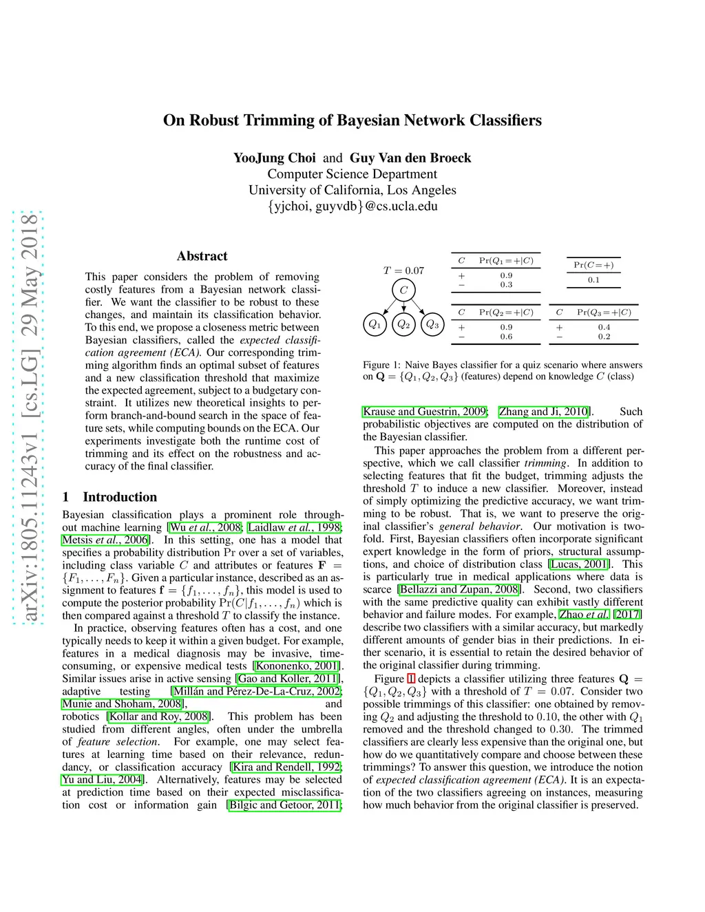 This paper considers the problem of removing costly features from a Bayesian network classifier. We want the classifier to be robust to these changes, and maintain its classification behavior. To this end, we propose a closeness metric between Bayesian classifiers, called the expected classification agreement (ECA). Our corresponding trimming algorithm finds an optimal subset of features and a new classification threshold that maximize the expected agreement, subject to a budgetary constraint. It utilizes new theoretical insights to perform branch-and-bound search in the space of feature sets, while computing bounds on the ECA. Our experiments investigate both the runtime cost of trimming and its effect on the robustness and accuracy of the final classifier.