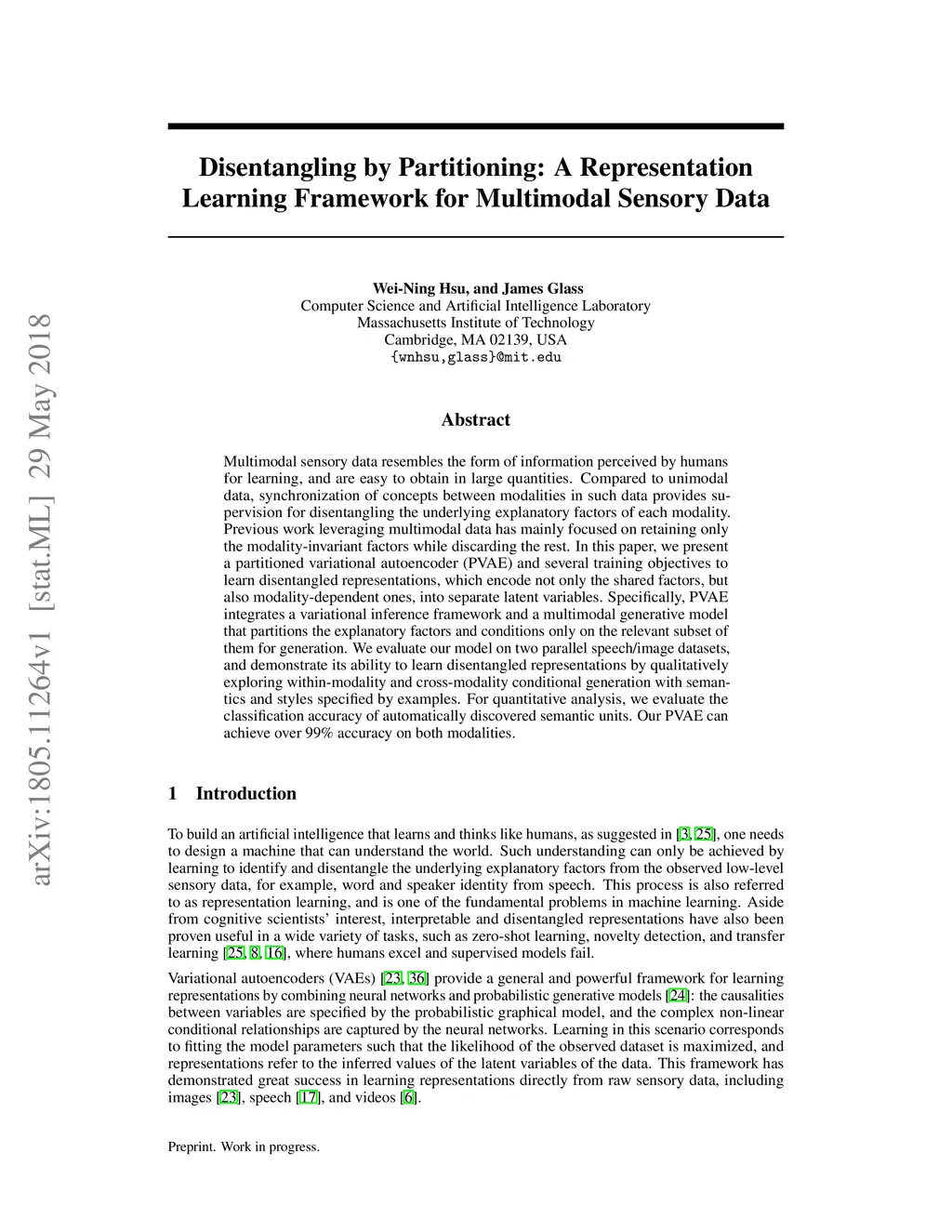 Multimodal sensory data resembles the form of information perceived by humans for learning, and are easy to obtain in large quantities. Compared to unimodal data, synchronization of concepts between modalities in such data provides supervision for disentangling the underlying explanatory factors of each modality. Previous work leveraging multimodal data has mainly focused on retaining only the modality-invariant factors while discarding the rest. In this paper, we present a partitioned variational autoencoder (PVAE) and several training objectives to learn disentangled representations, which encode not only the shared factors, but also modality-dependent ones, into separate latent variables. Specifically, PVAE integrates a variational inference framework and a multimodal generative model that partitions the explanatory factors and conditions only on the relevant subset of them for generation. We evaluate our model on two parallel speech/image datasets, and demonstrate its ability to learn disentangled representations by qualitatively exploring within-modality and cross-modality conditional generation with semantics and styles specified by examples. For quantitative analysis, we evaluate the classification accuracy of automatically discovered semantic units. Our PVAE can achieve over 99% accuracy on both modalities.