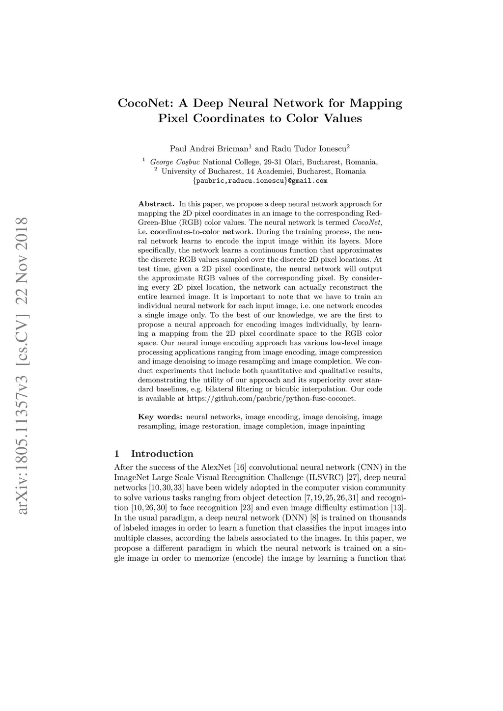 CocoNet: A deep neural network for mapping pixel coordinates to color