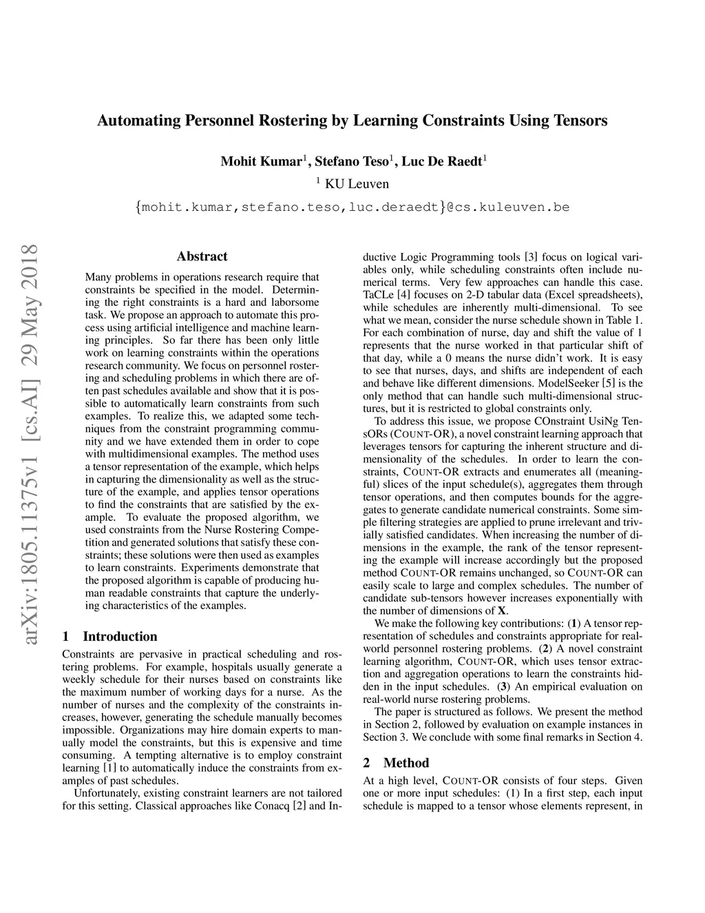Many problems in operations research require that constraints be specified in the model. Determining the right constraints is a hard and laborsome task. We propose an approach to automate this process using artificial intelligence and machine learning principles. So far there has been only little work on learning constraints within the operations research community. We focus on personnel rostering and scheduling problems in which there are often past schedules available and show that it is possible to automatically learn constraints from such examples. To realize this, we adapted some techniques from the constraint programming community and we have extended them in order to cope with multidimensional examples. The method uses a tensor representation of the example, which helps in capturing the dimensionality as well as the structure of the example, and applies tensor operations to find the constraints that are satisfied by the example. To evaluate the proposed algorithm, we used constraints from the Nurse Rostering Competition and generated solutions that satisfy these constraints; these solutions were then used as examples to learn constraints. Experiments demonstrate that the proposed algorithm is capable of producing human readable constraints that capture the underlying characteristics of the examples.