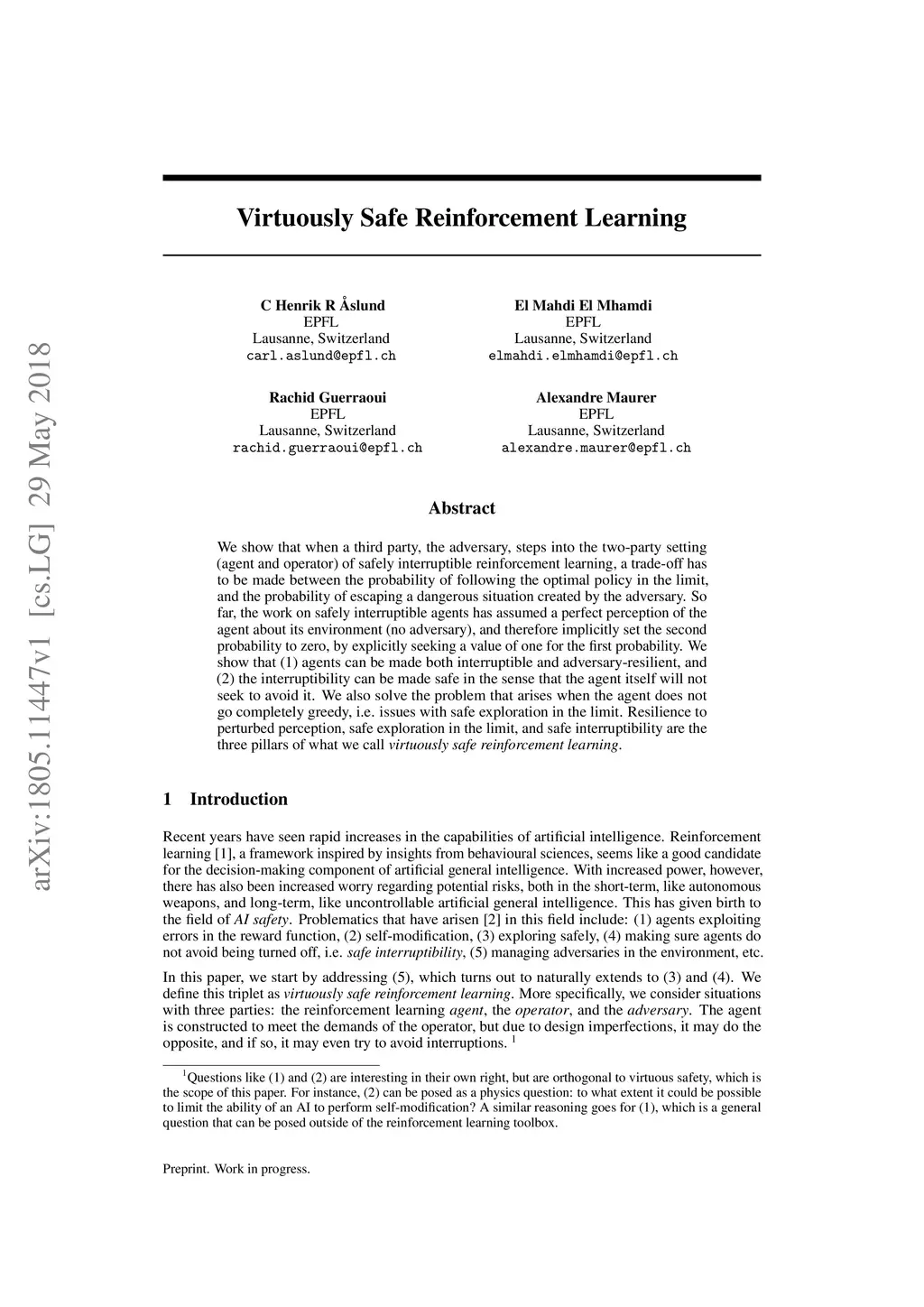 We show that when a third party, the adversary, steps into the two-party setting (agent and operator) of safely interruptible reinforcement learning, a trade-off has to be made between the probability of following the optimal policy in the limit, and the probability of escaping a dangerous situation created by the adversary. So far, the work on safely interruptible agents has assumed a perfect perception of the agent about its environment (no adversary), and therefore implicitly set the second probability to zero, by explicitly seeking a value of one for the first probability. We show that (1) agents can be made both interruptible and adversary-resilient, and (2) the interruptibility can be made safe in the sense that the agent itself will not seek to avoid it. We also solve the problem that arises when the agent does not go completely greedy, i.e. issues with safe exploration in the limit. Resilience to perturbed perception, safe exploration in the limit, and safe interruptibility are the three pillars of what we call \emph{virtuously safe reinforcement learning}.