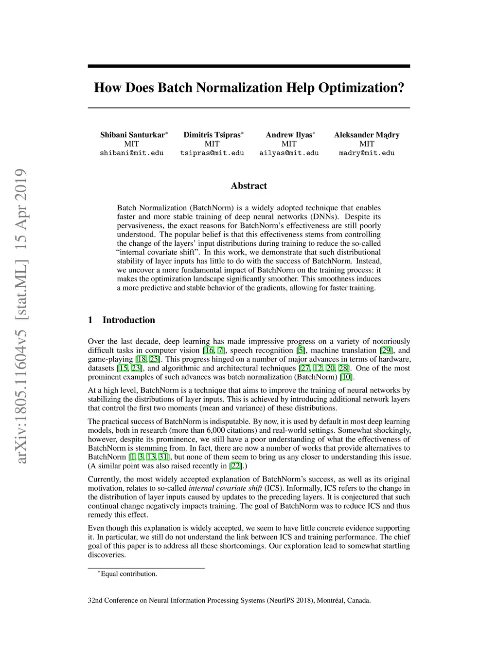 Batch Normalization (BatchNorm) is a widely adopted technique that enables faster and more stable training of deep neural networks (DNNs). Despite its pervasiveness, the exact reasons for BatchNorm's effectiveness are still poorly understood. The popular belief is that this effectiveness stems from controlling the change of the layers' input distributions during training to reduce the so-called "internal covariate shift". In this work, we demonstrate that such distributional stability of layer inputs has little to do with the success of BatchNorm. Instead, we uncover a more fundamental impact of BatchNorm on the training process: it makes the optimization landscape significantly smoother. This smoothness induces a more predictive and stable behavior of the gradients, allowing for faster training.