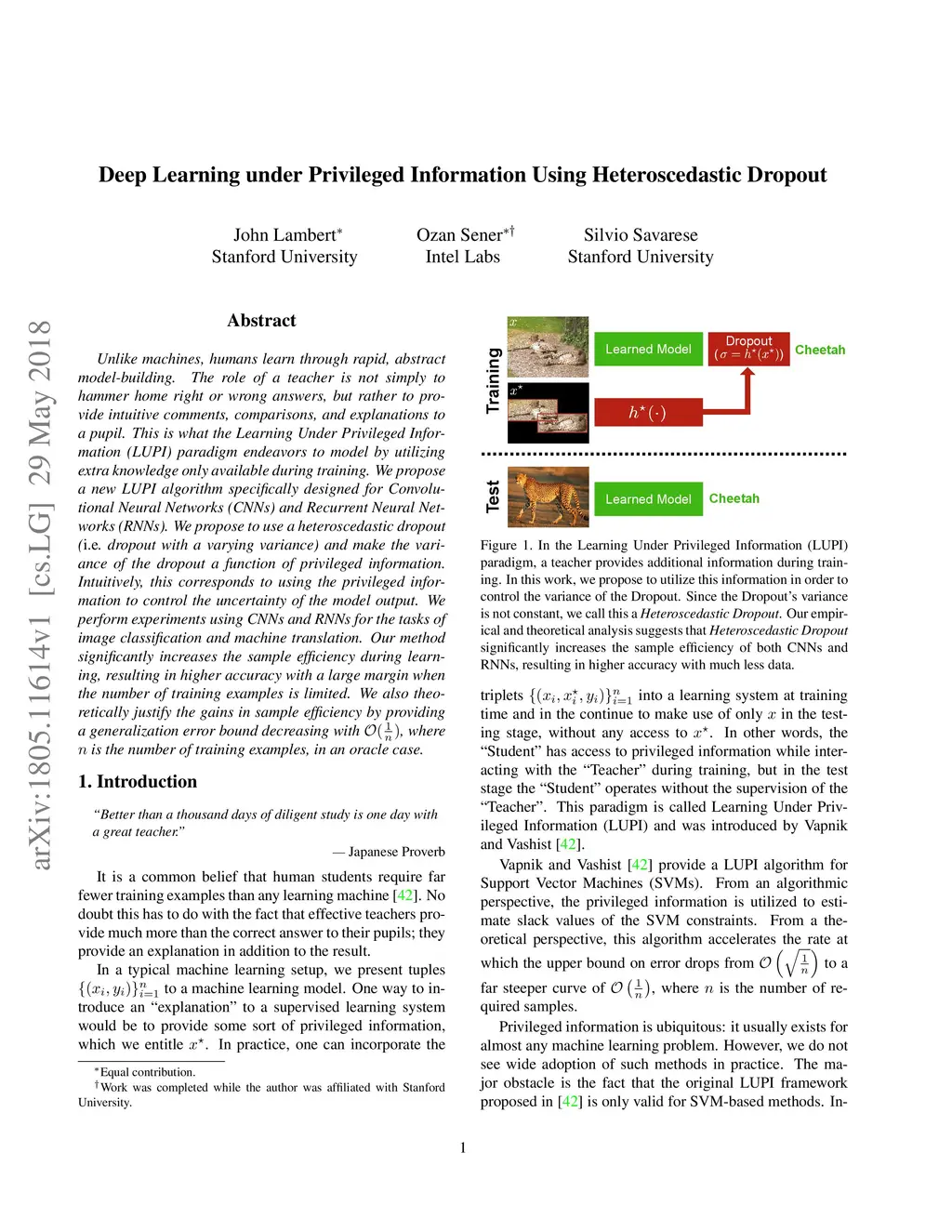 Unlike machines, humans learn through rapid, abstract model-building. The role of a teacher is not simply to hammer home right or wrong answers, but rather to provide intuitive comments, comparisons, and explanations to a pupil. This is what the Learning Under Privileged Information (LUPI) paradigm endeavors to model by utilizing extra knowledge only available during training. We propose a new LUPI algorithm specifically designed for Convolutional Neural Networks (CNNs) and Recurrent Neural Networks (RNNs). We propose to use a heteroscedastic dropout (i.e. dropout with a varying variance) and make the variance of the dropout a function of privileged information. Intuitively, this corresponds to using the privileged information to control the uncertainty of the model output. We perform experiments using CNNs and RNNs for the tasks of image classification and machine translation. Our method significantly increases the sample efficiency during learning, resulting in higher accuracy with a large margin when the number of training examples is limited. We also theoretically justify the gains in sample efficiency by providing a generalization error bound decreasing with , where is the number of training examples, in an oracle case.