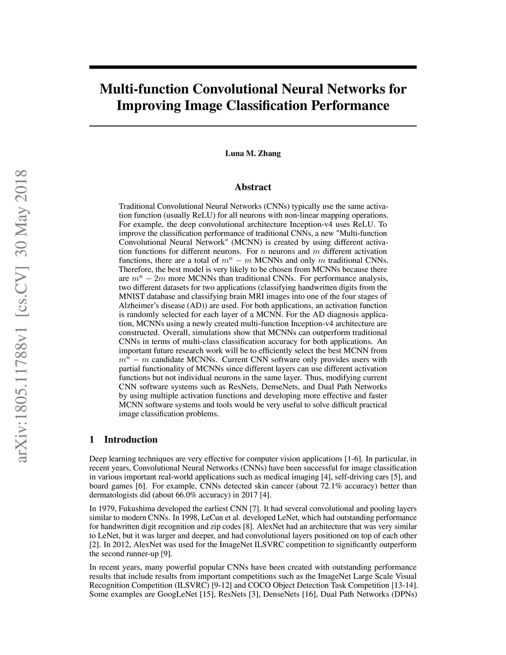 Traditional Convolutional Neural Networks (CNNs) typically use the same activation function (usually ReLU) for all neurons with non-linear mapping operations. For example, the deep convolutional architecture Inception-v4 uses ReLU. To improve the classification performance of traditional CNNs, a new "Multi-function Convolutional Neural Network" (MCNN) is created by using different activation functions for different neurons. For neurons and different activation functions, there are a total of MCNNs and only traditional CNNs. Therefore, the best model is very likely to be chosen from MCNNs because there are more MCNNs than traditional CNNs. For performance analysis, two different datasets for two applications (classifying handwritten digits from the MNIST database and classifying brain MRI images into one of the four stages of Alzheimer's disease (AD)) are used. For both applications, an activation function is randomly selected for each layer of a MCNN. For the AD diagnosis application, MCNNs using a newly created multi-function Inception-v4 architecture are constructed. Overall, simulations show that MCNNs can outperform traditional CNNs in terms of multi-class classification accuracy for both applications. An important future research work will be to efficiently select the best MCNN from candidate MCNNs. Current CNN software only provides users with partial functionality of MCNNs since different layers can use different activation functions but not individual neurons in the same layer. Thus, modifying current CNN software systems such as ResNets, DenseNets, and Dual Path Networks by using multiple activation functions and developing more effective and faster MCNN software systems and tools would be very useful to solve difficult practical image classification problems.