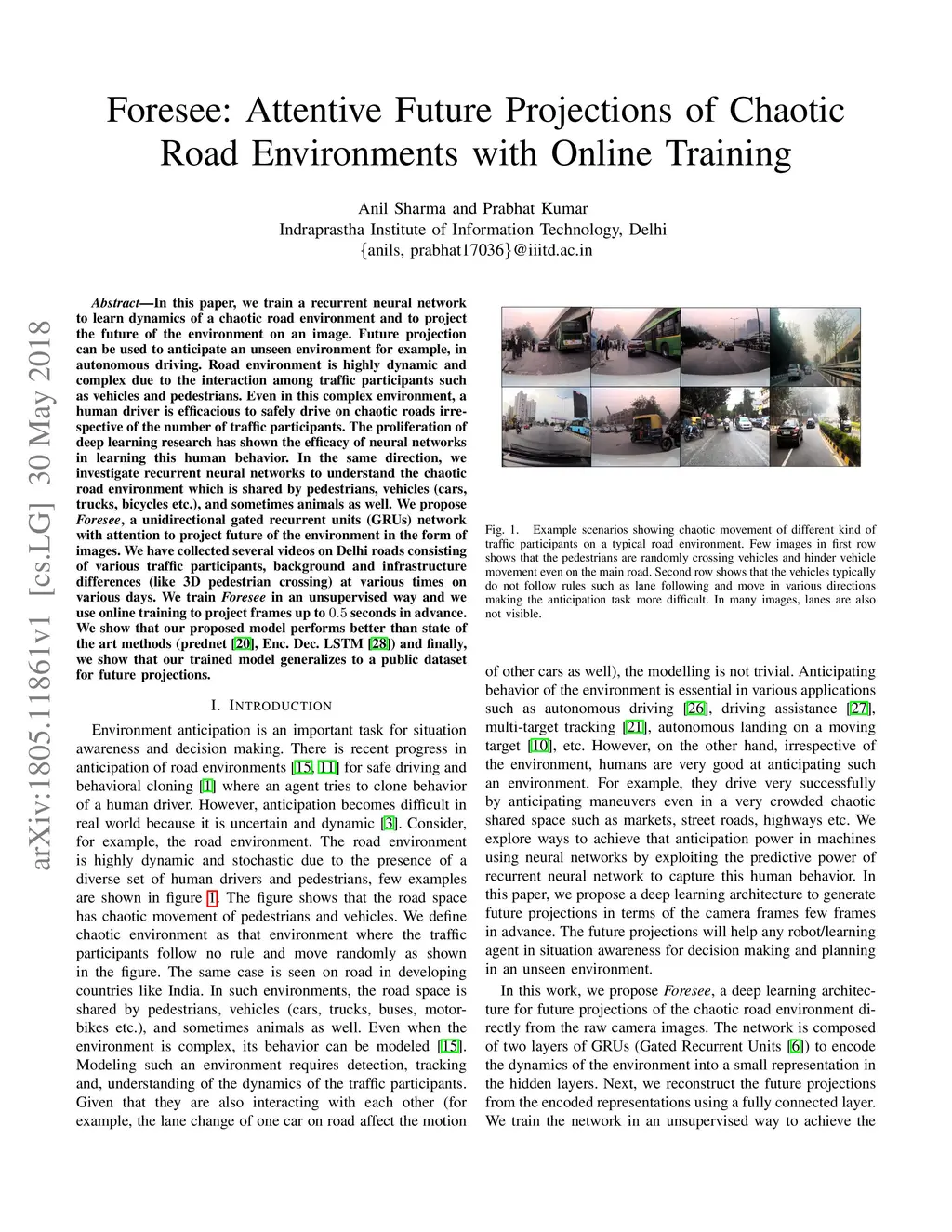In this paper, we train a recurrent neural network to learn dynamics of a chaotic road environment and to project the future of the environment on an image. Future projection can be used to anticipate an unseen environment for example, in autonomous driving. Road environment is highly dynamic and complex due to the interaction among traffic participants such as vehicles and pedestrians. Even in this complex environment, a human driver is efficacious to safely drive on chaotic roads irrespective of the number of traffic participants. The proliferation of deep learning research has shown the efficacy of neural networks in learning this human behavior. In the same direction, we investigate recurrent neural networks to understand the chaotic road environment which is shared by pedestrians, vehicles (cars, trucks, bicycles etc.), and sometimes animals as well. We propose \emph{Foresee}, a unidirectional gated recurrent units (GRUs) network with attention to project future of the environment in the form of images. We have collected several videos on Delhi roads consisting of various traffic participants, background and infrastructure differences (like 3D pedestrian crossing) at various times on various days. We train \emph{Foresee} in an unsupervised way and we use online training to project frames up to seconds in advance. We show that our proposed model performs better than state of the art methods (prednet and Enc. Dec. LSTM) and finally, we show that our trained model generalizes to a public dataset for future projections.