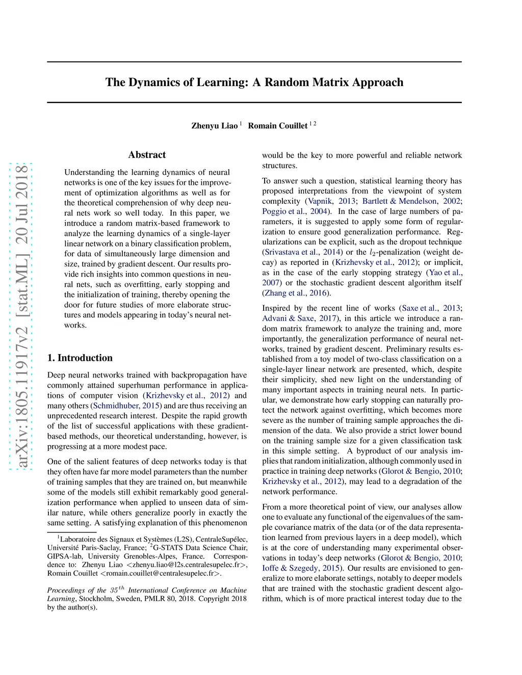Understanding the learning dynamics of neural networks is one of the key issues for the improvement of optimization algorithms as well as for the theoretical comprehension of why deep neural nets work so well today. In this paper, we introduce a random matrix-based framework to analyze the learning dynamics of a single-layer linear network on a binary classification problem, for data of simultaneously large dimension and size, trained by gradient descent. Our results provide rich insights into common questions in neural nets, such as overfitting, early stopping and the initialization of training, thereby opening the door for future studies of more elaborate structures and models appearing in today's neural networks.