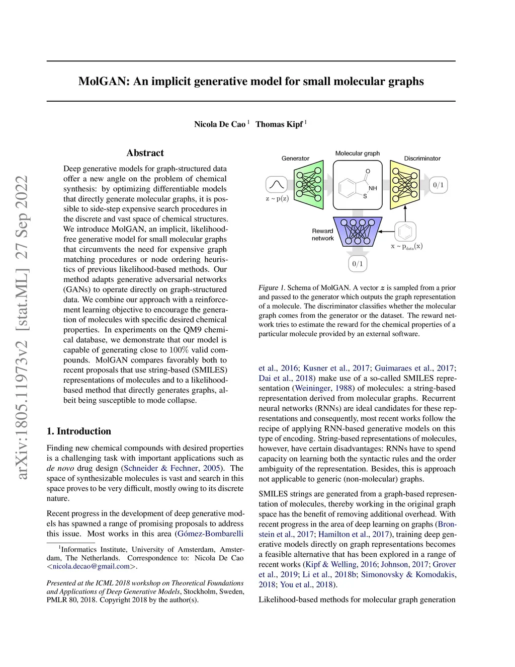 MolGAN: An implicit generative model for small molecular graphs