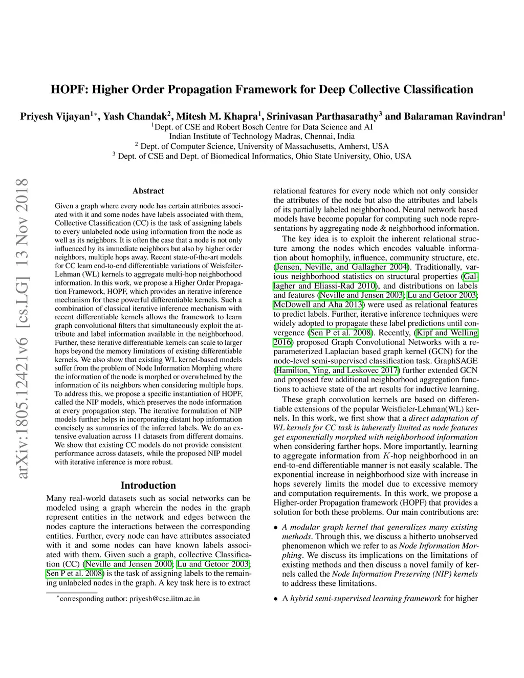 Given a graph wherein every node has certain attributes associated with it and some nodes have labels associated with them, Collective Classification (CC) is the task of assigning labels to every unlabeled node using information from the node as well as its neighbors. It is often the case that a node is not only influenced by its immediate neighbors but also by its higher order neighbors, multiple hops away. Recent state-of-the-art models for CC use differentiable variations of Weisfeiler-Lehman kernels to aggregate multi-hop neighborhood information. However, in this work, we show that these models suffer from the problem of Node Information Morphing wherein the information of the node is morphed or overwhelmed by the information of its neighbors when considering multiple hops. Further, existing models are not scalable as the memory and computation needs grow exponentially with the number of hops considered. To circumvent these problems, we propose a generic Higher Order Propagation Framework (HOPF) which includes (i) a differentiable Node Information Preserving (NIP) kernel and (ii) a scalable iterative learning and inferencing mechanism to aggregate information over larger hops. We do an extensive evaluation using 11 datasets from different domains and show that unlike existing CC models, our NIP model with iterative inference is robust across all the datasets and can handle much larger neighborhoods in a scalable manner.