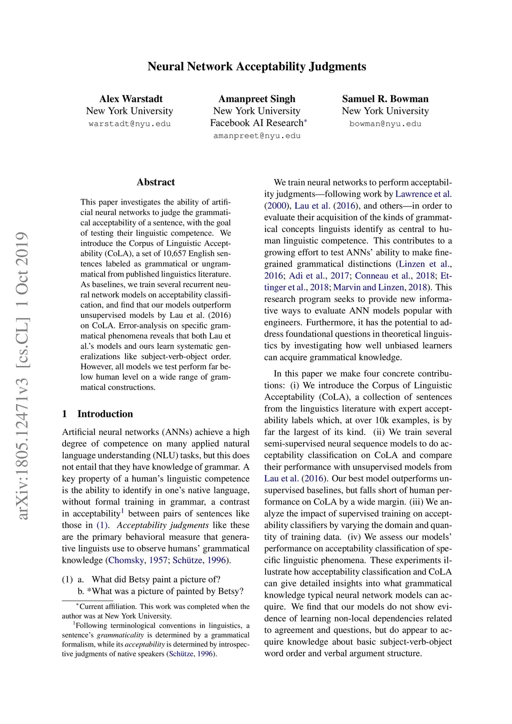 Neural Network Acceptability Judgments