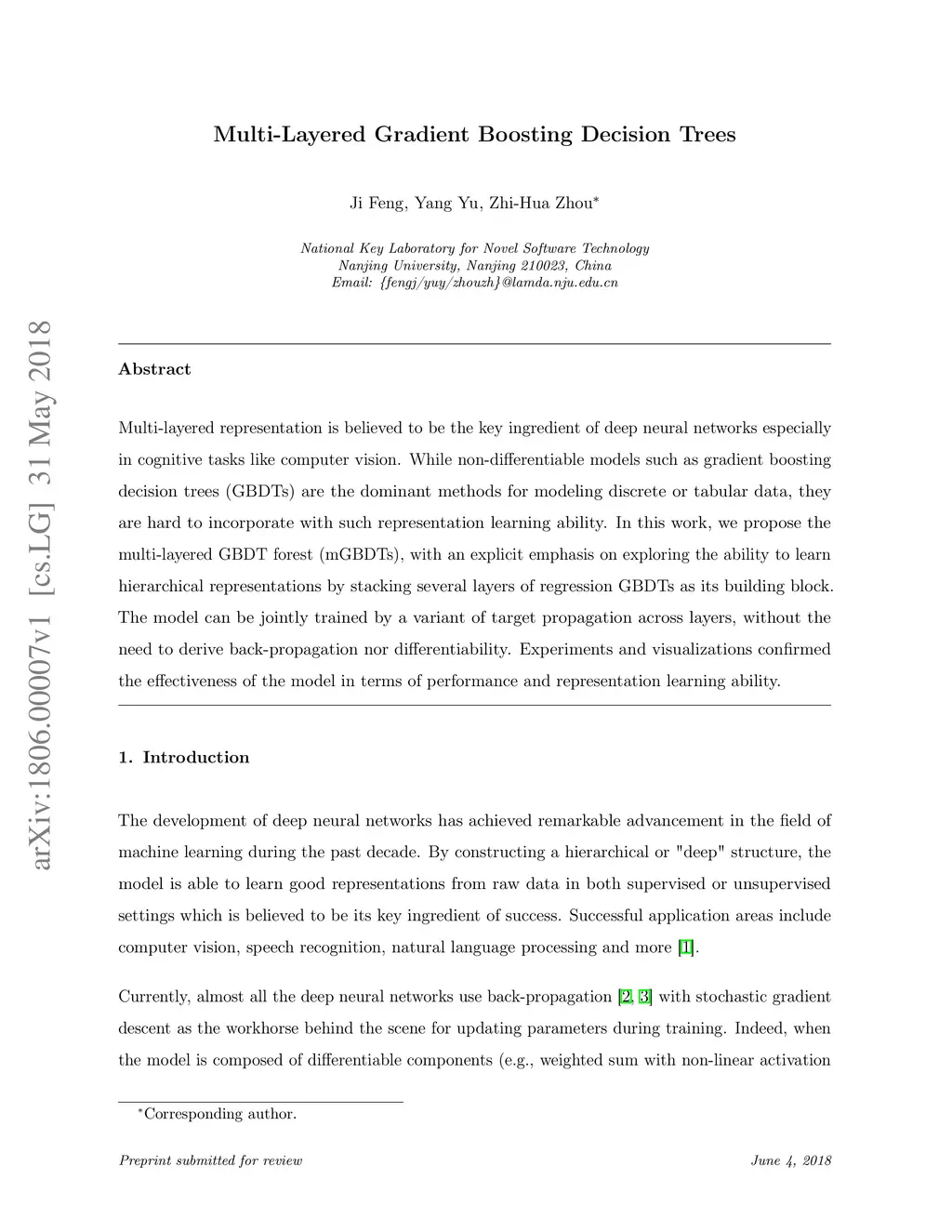 Multi-layered representation is believed to be the key ingredient of deep neural networks especially in cognitive tasks like computer vision. While non-differentiable models such as gradient boosting decision trees (GBDTs) are the dominant methods for modeling discrete or tabular data, they are hard to incorporate with such representation learning ability. In this work, we propose the multi-layered GBDT forest (mGBDTs), with an explicit emphasis on exploring the ability to learn hierarchical representations by stacking several layers of regression GBDTs as its building block. The model can be jointly trained by a variant of target propagation across layers, without the need to derive back-propagation nor differentiability. Experiments and visualizations confirmed the effectiveness of the model in terms of performance and representation learning ability.