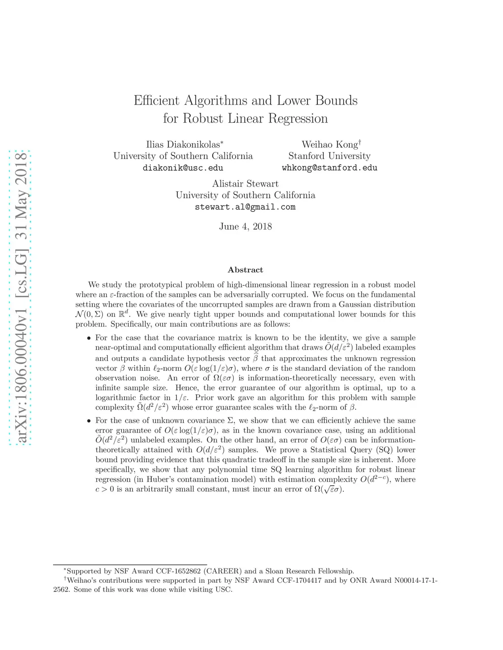 We study the problem of high-dimensional linear regression in a robust model where an -fraction of the samples can be adversarially corrupted. We focus on the fundamental setting where the covariates of the uncorrupted samples are drawn from a Gaussian distribution on . We give nearly tight upper bounds and computational lower bounds for this problem. Specifically, our main contributions are as follows: For the case that the covariance matrix is known to be the identity, we give a sample near-optimal and computationally efficient algorithm that outputs a candidate hypothesis vector which approximates the unknown regression vector within -norm , where is the standard deviation of the random observation noise. An error of is information-theoretically necessary, even with infinite sample size. Prior work gave an algorithm for this problem with sample complexity whose error guarantee scales with the -norm of . For the case of unknown covariance, we show that we can efficiently achieve the same error guarantee as in the known covariance case using an additional unlabeled examples. On the other hand, an error of can be information-theoretically attained with samples. We prove a Statistical Query (SQ) lower bound providing evidence that this quadratic tradeoff in the sample size is inherent. More specifically, we show that any polynomial time SQ learning algorithm for robust linear regression (in Huber's contamination model) with estimation complexity , where is an arbitrarily small constant, must incur an error of .
