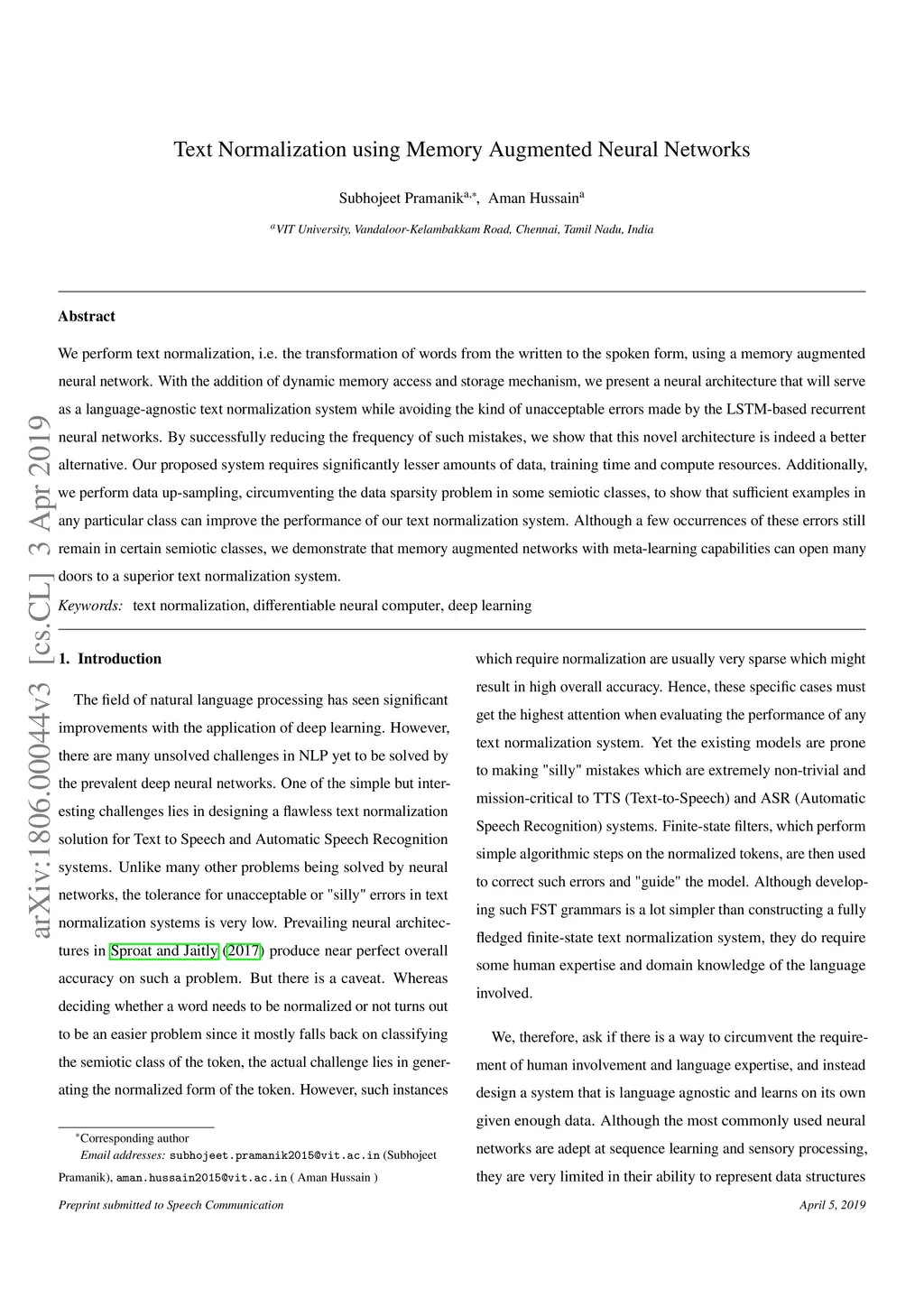 Text normalization using memory augmented neural networks