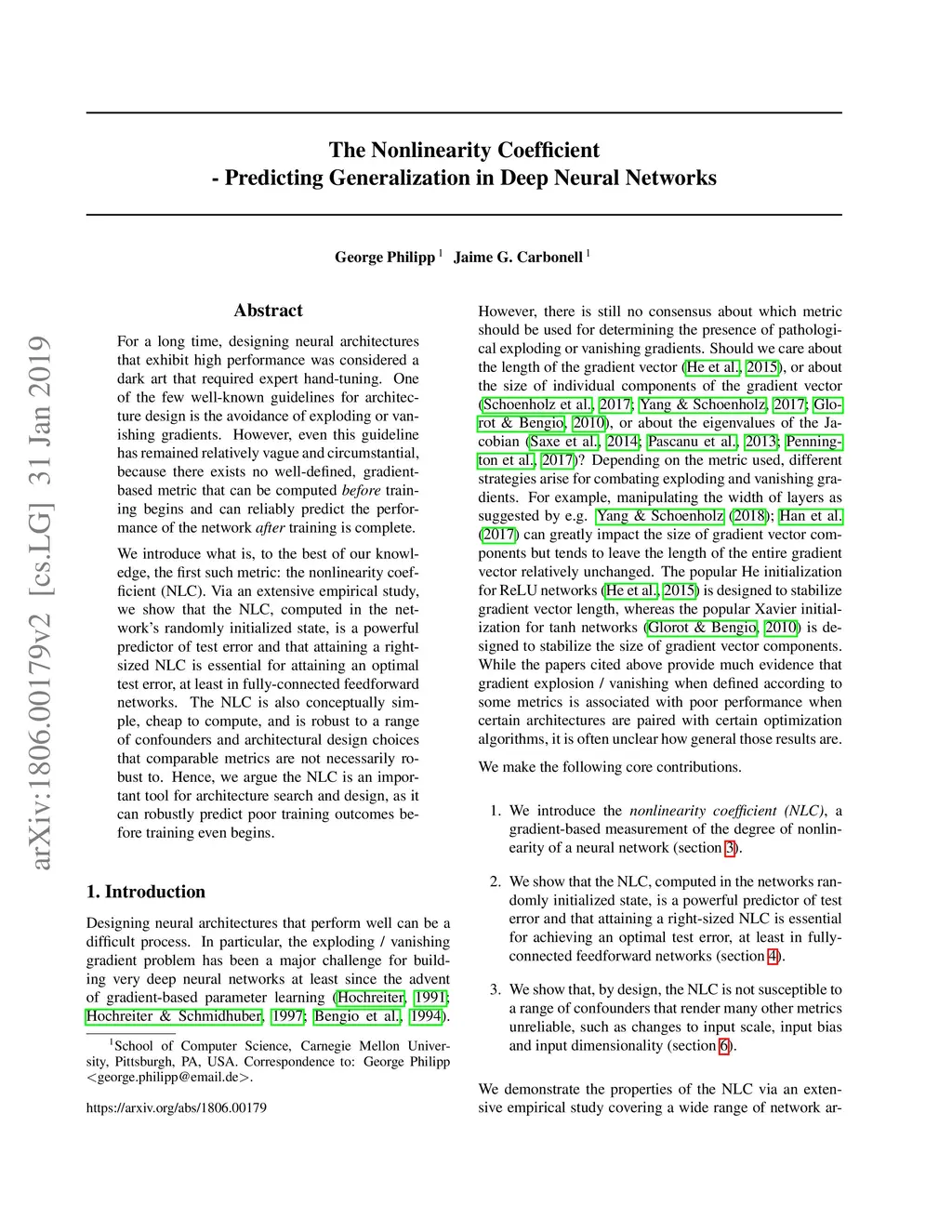 For a long time, designing neural architectures that exhibit high performance was considered a dark art that required expert hand-tuning. One of the few well-known guidelines for architecture design is the avoidance of exploding gradients, though even this guideline has remained relatively vague and circumstantial. We introduce the nonlinearity coefficient (NLC), a measurement of the complexity of the function computed by a neural network that is based on the magnitude of the gradient. Via an extensive empirical study, we show that the NLC is a powerful predictor of test error and that attaining a right-sized NLC is essential for optimal performance. The NLC exhibits a range of intriguing and important properties. It is closely tied to the amount of information gained from computing a single network gradient. It is tied to the error incurred when replacing the nonlinearity operations in the network with linear operations. It is not susceptible to the confounders of multiplicative scaling, additive bias and layer width. It is stable from layer to layer. Hence, we argue that the NLC is the first robust predictor of overfitting in deep networks.