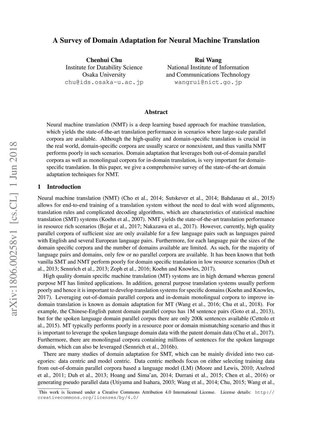 Neural machine translation (NMT) is a deep learning based approach for machine translation, which yields the state-of-the-art translation performance in scenarios where large-scale parallel corpora are available. Although the high-quality and domain-specific translation is crucial in the real world, domain-specific corpora are usually scarce or nonexistent, and thus vanilla NMT performs poorly in such scenarios. Domain adaptation that leverages both out-of-domain parallel corpora as well as monolingual corpora for in-domain translation, is very important for domain-specific translation. In this paper, we give a comprehensive survey of the state-of-the-art domain adaptation techniques for NMT.