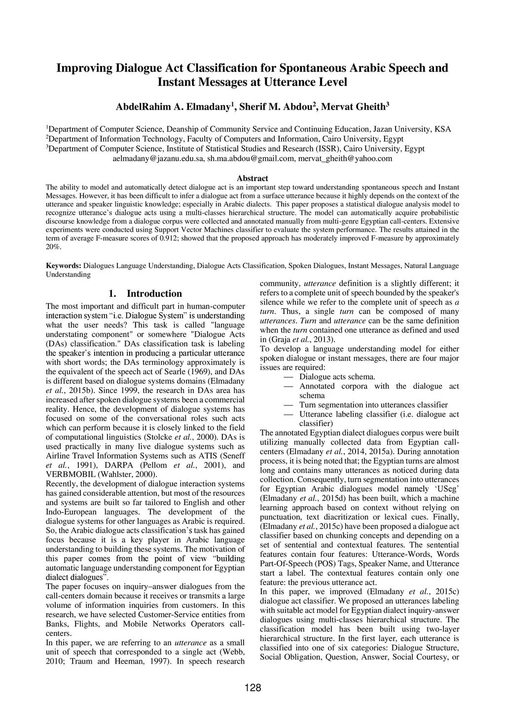 The ability to model and automatically detect dialogue act is an important step toward understanding spontaneous speech and Instant Messages. However, it has been difficult to infer a dialogue act from a surface utterance because it highly depends on the context of the utterance and speaker linguistic knowledge; especially in Arabic dialects. This paper proposes a statistical dialogue analysis model to recognize utterance's dialogue acts using a multi-classes hierarchical structure. The model can automatically acquire probabilistic discourse knowledge from a dialogue corpus were collected and annotated manually from multi-genre Egyptian call-centers. Extensive experiments were conducted using Support Vector Machines classifier to evaluate the system performance. The results attained in the term of average F-measure scores of 0.912; showed that the proposed approach has moderately improved F-measure by approximately 20%.