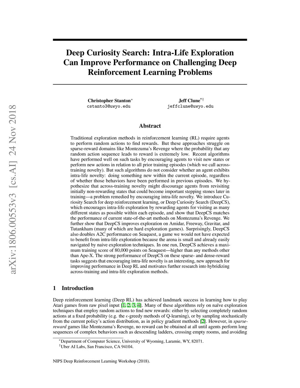 Traditional exploration methods in RL require agents to perform random actions to find rewards. But these approaches struggle on sparse-reward domains like Montezuma's Revenge where the probability that any random action sequence leads to reward is extremely low. Recent algorithms have performed well on such tasks by encouraging agents to visit new states or perform new actions in relation to all prior training episodes (which we call across-training novelty). But such algorithms do not consider whether an agent exhibits intra-life novelty: doing something new within the current episode, regardless of whether those behaviors have been performed in previous episodes. We hypothesize that across-training novelty might discourage agents from revisiting initially non-rewarding states that could become important stepping stones later in training. We introduce Deep Curiosity Search (DeepCS), which encourages intra-life exploration by rewarding agents for visiting as many different states as possible within each episode, and show that DeepCS matches the performance of current state-of-the-art methods on Montezuma's Revenge. We further show that DeepCS improves exploration on Amidar, Freeway, Gravitar, and Tutankham (many of which are hard exploration games). Surprisingly, DeepCS doubles A2C performance on Seaquest, a game we would not have expected to benefit from intra-life exploration because the arena is small and already easily navigated by naive exploration techniques. In one run, DeepCS achieves a maximum training score of 80,000 points on Seaquest, higher than any methods other than Ape-X. The strong performance of DeepCS on these sparse- and dense-reward tasks suggests that encouraging intra-life novelty is an interesting, new approach for improving performance in Deep RL and motivates further research into hybridizing across-training and intra-life exploration methods.