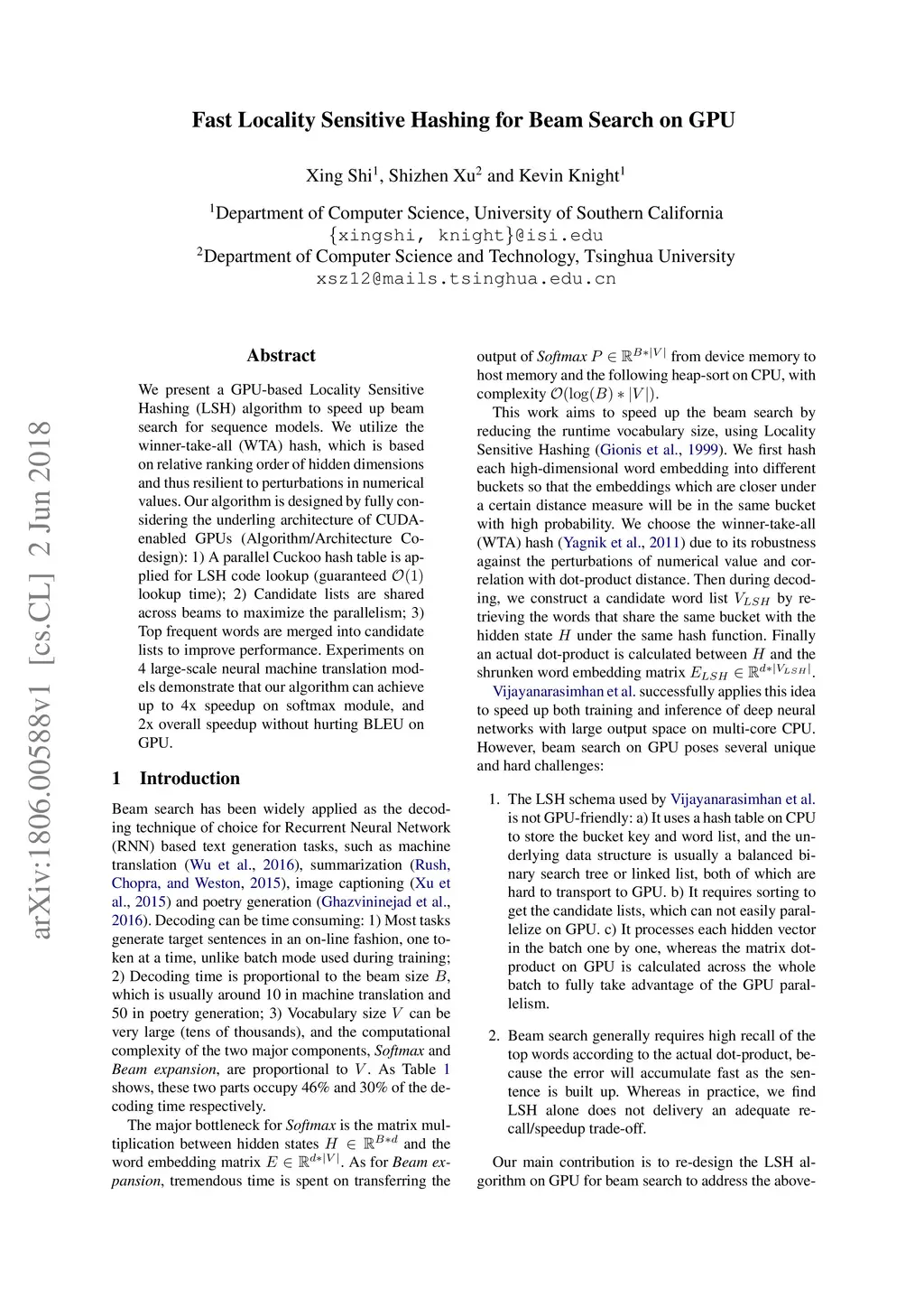 We present a GPU-based Locality Sensitive Hashing (LSH) algorithm to speed up beam search for sequence models. We utilize the winner-take-all (WTA) hash, which is based on relative ranking order of hidden dimensions and thus resilient to perturbations in numerical values. Our algorithm is designed by fully considering the underling architecture of CUDA-enabled GPUs (Algorithm/Architecture Co-design): 1) A parallel Cuckoo hash table is applied for LSH code lookup (guaranteed O(1) lookup time); 2) Candidate lists are shared across beams to maximize the parallelism; 3) Top frequent words are merged into candidate lists to improve performance. Experiments on 4 large-scale neural machine translation models demonstrate that our algorithm can achieve up to 4x speedup on softmax module, and 2x overall speedup without hurting BLEU on GPU.