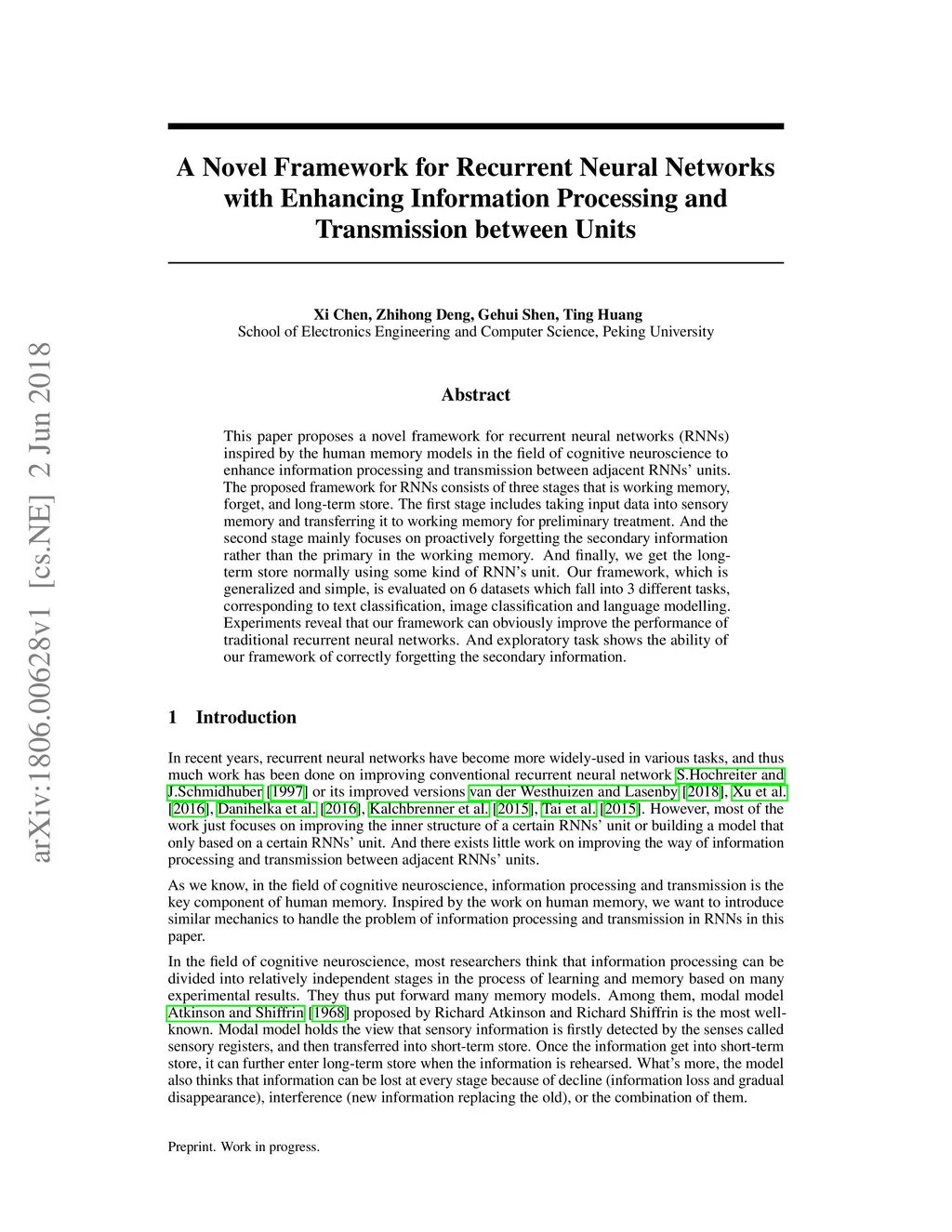This paper proposes a novel framework for recurrent neural networks (RNNs) inspired by the human memory models in the field of cognitive neuroscience to enhance information processing and transmission between adjacent RNNs' units. The proposed framework for RNNs consists of three stages that is working memory, forget, and long-term store. The first stage includes taking input data into sensory memory and transferring it to working memory for preliminary treatment. And the second stage mainly focuses on proactively forgetting the secondary information rather than the primary in the working memory. And finally, we get the long-term store normally using some kind of RNN's unit. Our framework, which is generalized and simple, is evaluated on 6 datasets which fall into 3 different tasks, corresponding to text classification, image classification and language modelling. Experiments reveal that our framework can obviously improve the performance of traditional recurrent neural networks. And exploratory task shows the ability of our framework of correctly forgetting the secondary information.