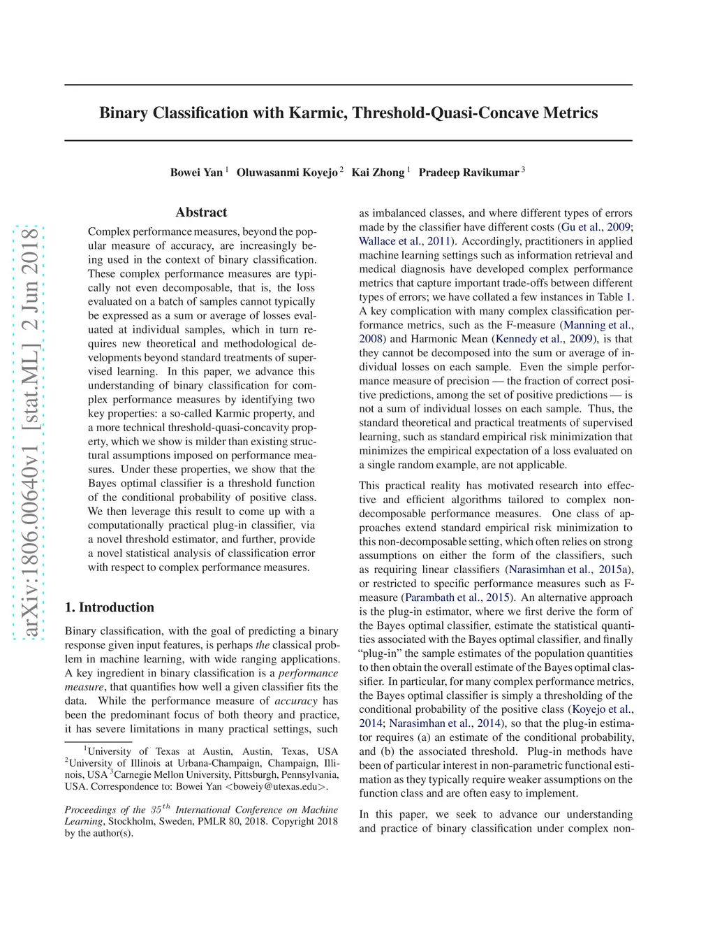 Complex performance measures, beyond the popular measure of accuracy, are increasingly being used in the context of binary classification. These complex performance measures are typically not even decomposable, that is, the loss evaluated on a batch of samples cannot typically be expressed as a sum or average of losses evaluated at individual samples, which in turn requires new theoretical and methodological developments beyond standard treatments of supervised learning. In this paper, we advance this understanding of binary classification for complex performance measures by identifying two key properties: a so-called Karmic property, and a more technical threshold-quasi-concavity property, which we show is milder than existing structural assumptions imposed on performance measures. Under these properties, we show that the Bayes optimal classifier is a threshold function of the conditional probability of positive class. We then leverage this result to come up with a computationally practical plug-in classifier, via a novel threshold estimator, and further, provide a novel statistical analysis of classification error with respect to complex performance measures.