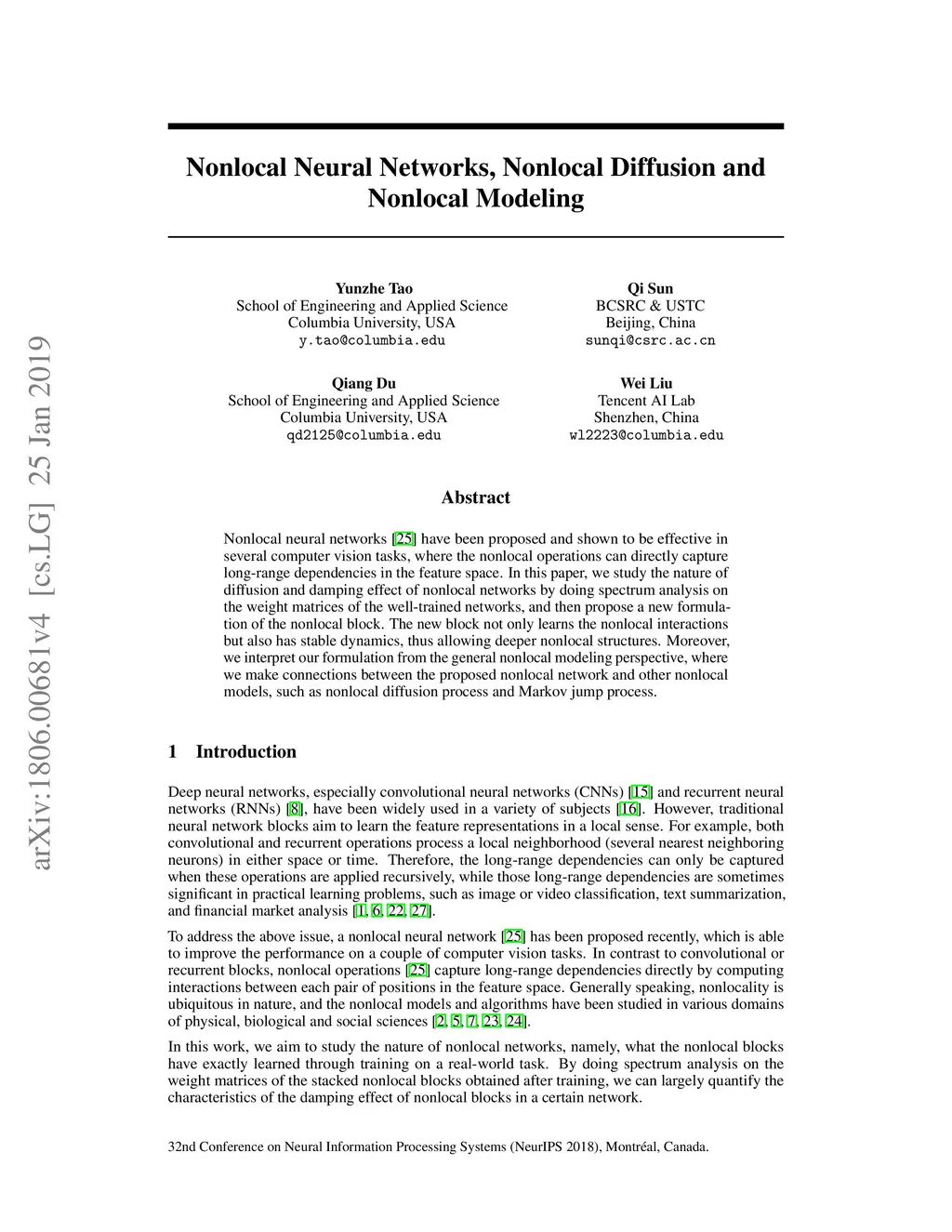 Nonlocal neural networks have been proposed and shown to be effective in several computer vision tasks, where the nonlocal operations can directly capture long-range dependencies in the feature space. In this paper, we study the nature of diffusion and damping effect of nonlocal networks by doing spectrum analysis on the weight matrices of the well-trained networks, and then propose a new formulation of the nonlocal block. The new block not only learns the nonlocal interactions but also has stable dynamics, thus allowing deeper nonlocal structures. Moreover, we interpret our formulation from the general nonlocal modeling perspective, where we make connections between the proposed nonlocal network and other nonlocal models, such as nonlocal diffusion process and Markov jump process.
