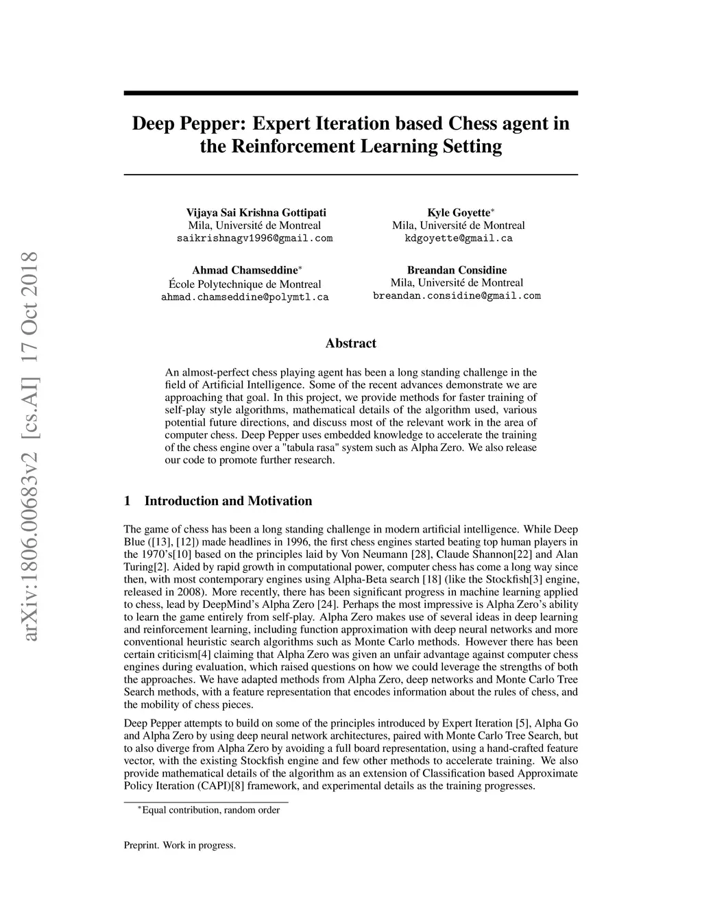 An almost-perfect chess playing agent has been a long standing challenge in the field of Artificial Intelligence. Some of the recent advances demonstrate we are approaching that goal. In this project, we provide methods for faster training of self-play style algorithms, mathematical details of the algorithm used, various potential future directions, and discuss most of the relevant work in the area of computer chess. Deep Pepper uses embedded knowledge to accelerate the training of the chess engine over a "tabula rasa" system such as Alpha Zero. We also release our code to promote further research.