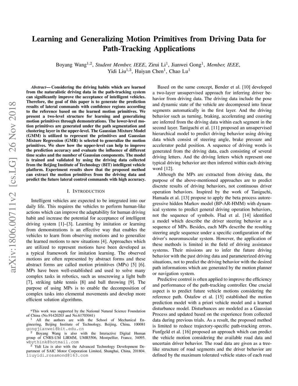 Considering the driving habits which are learned from the naturalistic driving data in the path-tracking system can significantly improve the acceptance of intelligent vehicles. Therefore, the goal of this paper is to generate the prediction results of lateral commands with confidence regions according to the reference based on the learned motion primitives. We present a two-level structure for learning and generalizing motion primitives through demonstrations. The lower-level motion primitives are generated under the path segmentation and clustering layer in the upper-level. The Gaussian Mixture Model(GMM) is utilized to represent the primitives and Gaussian Mixture Regression (GMR) is selected to generalize the motion primitives. We show how the upper-level can help to improve the prediction accuracy and evaluate the influence of different time scales and the number of Gaussian components. The model is trained and validated by using the driving data collected from the Beijing Institute of Technology (BIT) intelligent vehicle platform. Experiment results show that the proposed method can extract the motion primitives from the driving data and predict the future lateral control commands with high accuracy.