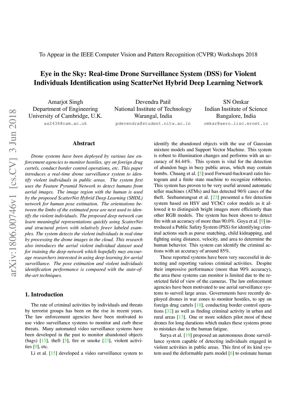 Drone systems have been deployed by various law enforcement agencies to monitor hostiles, spy on foreign drug cartels, conduct border control operations, etc. This paper introduces a real-time drone surveillance system to identify violent individuals in public areas. The system first uses the Feature Pyramid Network to detect humans from aerial images. The image region with the human is used by the proposed ScatterNet Hybrid Deep Learning (SHDL) network for human pose estimation. The orientations between the limbs of the estimated pose are next used to identify the violent individuals. The proposed deep network can learn meaningful representations quickly using ScatterNet and structural priors with relatively fewer labeled examples. The system detects the violent individuals in real-time by processing the drone images in the cloud. This research also introduces the aerial violent individual dataset used for training the deep network which hopefully may encourage researchers interested in using deep learning for aerial surveillance. The pose estimation and violent individuals identification performance is compared with the state-of-the-art techniques.