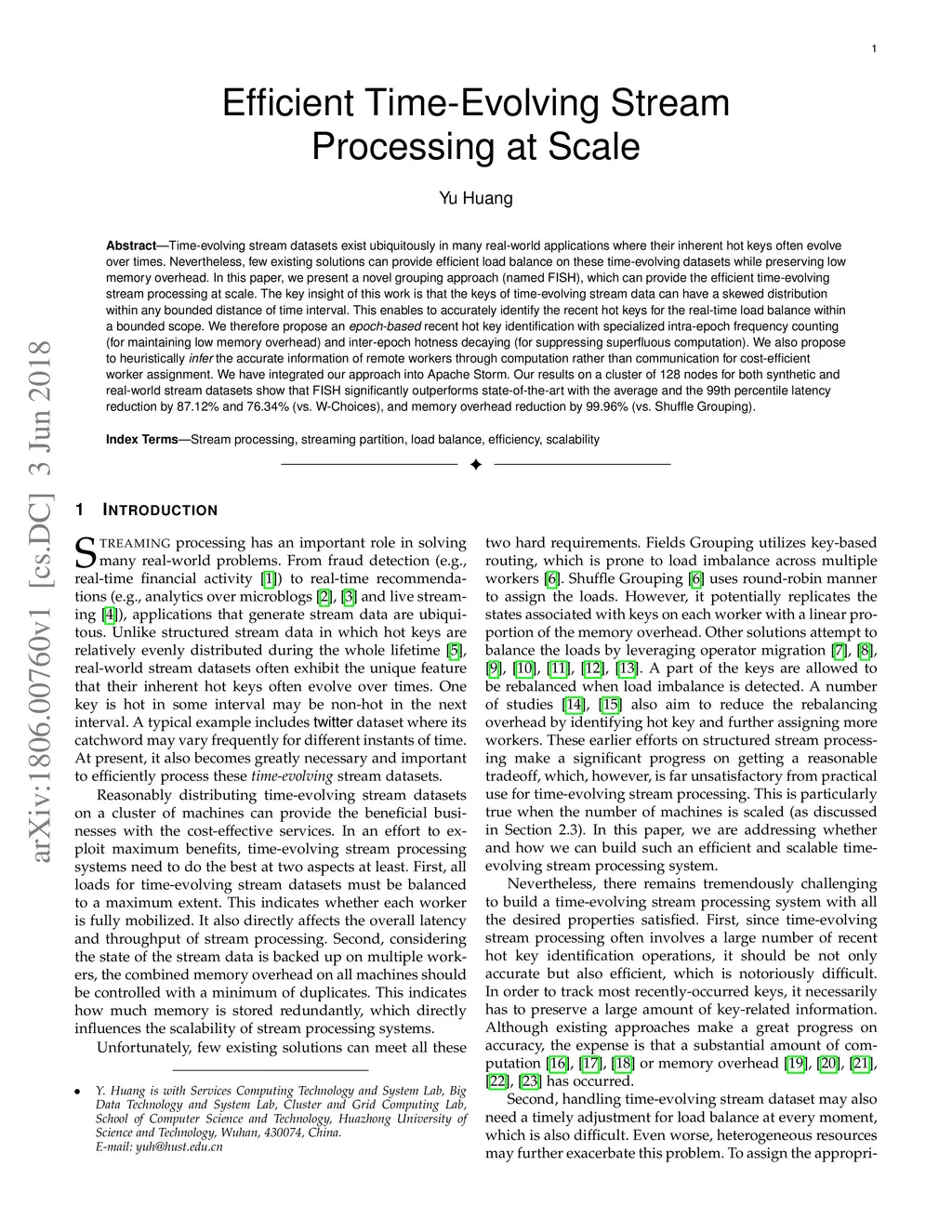 Time-evolving stream datasets exist ubiquitously in many real-world applications where their inherent hot keys often evolve over times. Nevertheless, few existing solutions can provide efficient load balance on these time-evolving datasets while preserving low memory overhead. In this paper, we present a novel grouping approach (named FISH), which can provide the efficient time-evolving stream processing at scale. The key insight of this work is that the keys of time-evolving stream data can have a skewed distribution within any bounded distance of time interval. This enables to accurately identify the recent hot keys for the real-time load balance within a bounded scope. We therefore propose an epoch-based recent hot key identification with specialized intra-epoch frequency counting (for maintaining low memory overhead) and inter-epoch hotness decaying (for suppressing superfluous computation). We also propose to heuristically infer the accurate information of remote workers through computation rather than communication for cost-efficient worker assignment. We have integrated our approach into Apache Storm. Our results on a cluster of 128 nodes for both synthetic and real-world stream datasets show that FISH significantly outperforms state-of-the-art with the average and the 99th percentile latency reduction by 87.12% and 76.34% (vs. W-Choices), and memory overhead reduction by 99.96% (vs. Shuffle Grouping).
