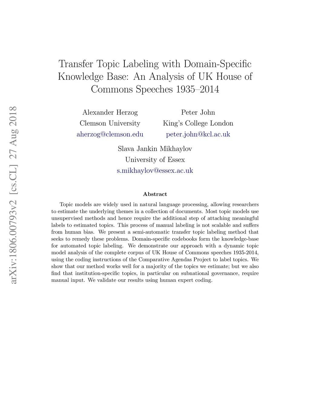 Topic models are widely used in natural language processing, allowing researchers to estimate the underlying themes in a collection of documents. Most topic models use unsupervised methods and hence require the additional step of attaching meaningful labels to estimated topics. This process of manual labeling is not scalable and suffers from human bias. We present a semi-automatic transfer topic labeling method that seeks to remedy these problems. Domain-specific codebooks form the knowledge-base for automated topic labeling. We demonstrate our approach with a dynamic topic model analysis of the complete corpus of UK House of Commons speeches 1935-2014, using the coding instructions of the Comparative Agendas Project to label topics. We show that our method works well for a majority of the topics we estimate; but we also find that institution-specific topics, in particular on subnational governance, require manual input. We validate our results using human expert coding.