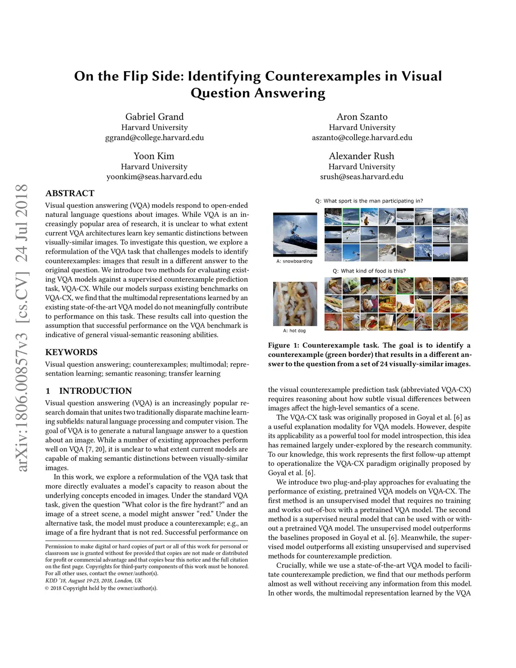 Visual question answering (VQA) models respond to open-ended natural language questions about images. While VQA is an increasingly popular area of research, it is unclear to what extent current VQA architectures learn key semantic distinctions between visually-similar images. To investigate this question, we explore a reformulation of the VQA task that challenges models to identify counterexamples: images that result in a different answer to the original question. We introduce two methods for evaluating existing VQA models against a supervised counterexample prediction task, VQA-CX. While our models surpass existing benchmarks on VQA-CX, we find that the multimodal representations learned by an existing state-of-the-art VQA model do not meaningfully contribute to performance on this task. These results call into question the assumption that successful performance on the VQA benchmark is indicative of general visual-semantic reasoning abilities.