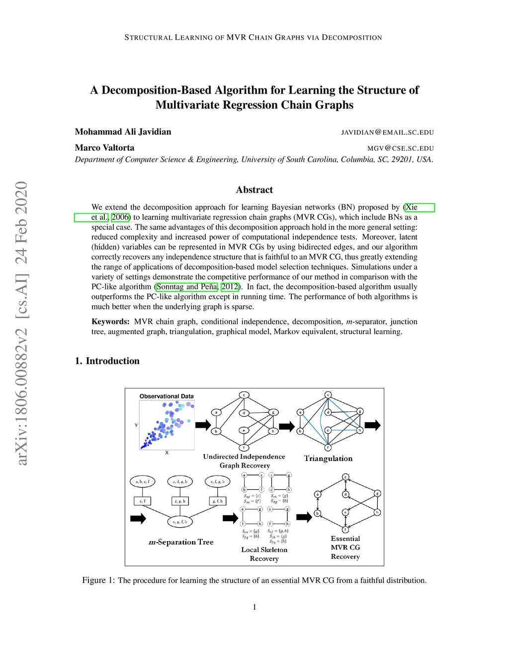 We extend the decomposition approach for learning Bayesian networks (BN) proposed by (Xie et al., 2006) to learning multivariate regression chain graphs (MVR CGs), which include BNs as a special case. The same advantages of this decomposition approach hold in the more general setting: reduces complexity and increased power of computational independence tests. Moreover, latent (hidden) variables can be represented in MVR CGs by using bidirected edges, and our algorithm correctly recovers any independence structure that is faithful to a MVR CG, thus greatly extending the range of applications of decomposition-based model selection techniques. While our new algorithm has the same complexity as the one in (Xie et al., 2006) for BNs, it requires larger components for general MVR CGs, to insure that sufficient data is present to estimate parameters.